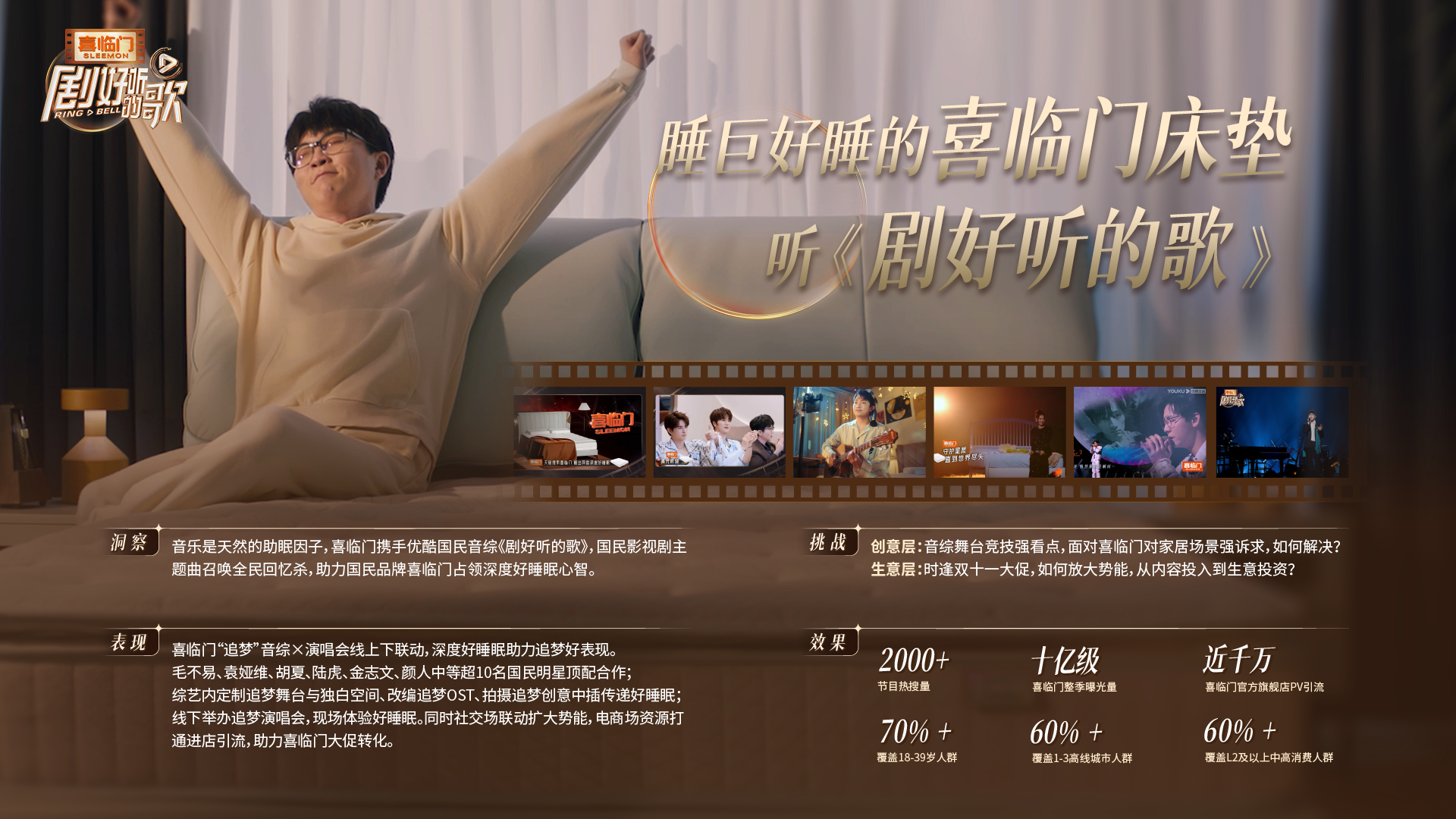 “睡巨好睡的喜临门床垫,听《剧好听的歌》”案例中,喜临门床垫通过与《剧好听的歌》综艺的合作,打造了综演联动的新模式。节目内,全明星的倾力植入和高质量的品牌内容呈现,为观众带来了深度好睡眠的视觉与情感体验;节目外,通过电商公私域的打通和创新的营销玩法,喜临门成功实现了品牌声量与销量的双提升,为未来家居行业的营销创新提供了新的借鉴,展现了未来品牌与娱乐内容结合的营销潜力。