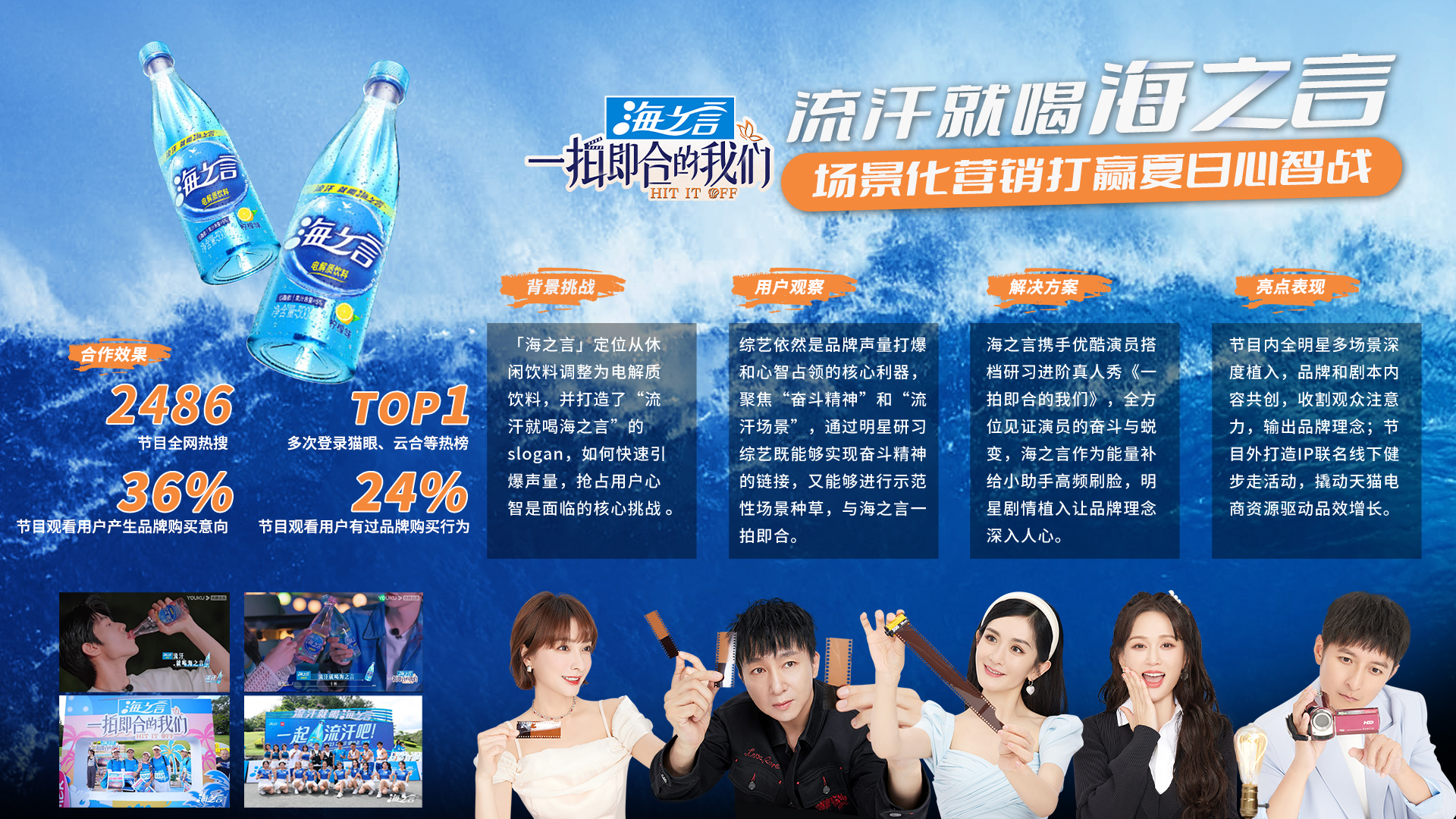 “流汗就喝海之言,场景化营销打赢夏日心智战”案例中,海之言精准洞察后疫情时代电解质饮料的市场机遇,将产品定位从休闲饮料转变为电解质饮料,并巧妙地以“奋斗哪能不流汗,流汗就喝海之言”为slogan,深度绑定奋斗与流汗的场景。通过与《一拍即合的我们》综艺合作,海之言不仅在节目中深度内容共创,见证了青年演员的成长蜕变,更在节目外通过IP联名活动和电商资源联动,实现了品牌声量与销量的双提升,成功将品牌理念植入消费者心智,为未来饮料市场的营销提供了新的范式。