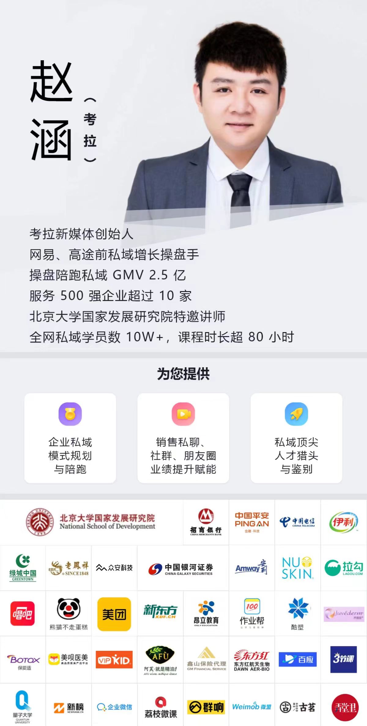 考拉:考拉新媒体创始人,网易、高徒前私域增长操盘手,操盘陪跑私域GMV2.5亿,服务500强企业超过10家,北京大学国家发展研究院特邀讲师,全网私域学员数10W+,课程时长超80小时。