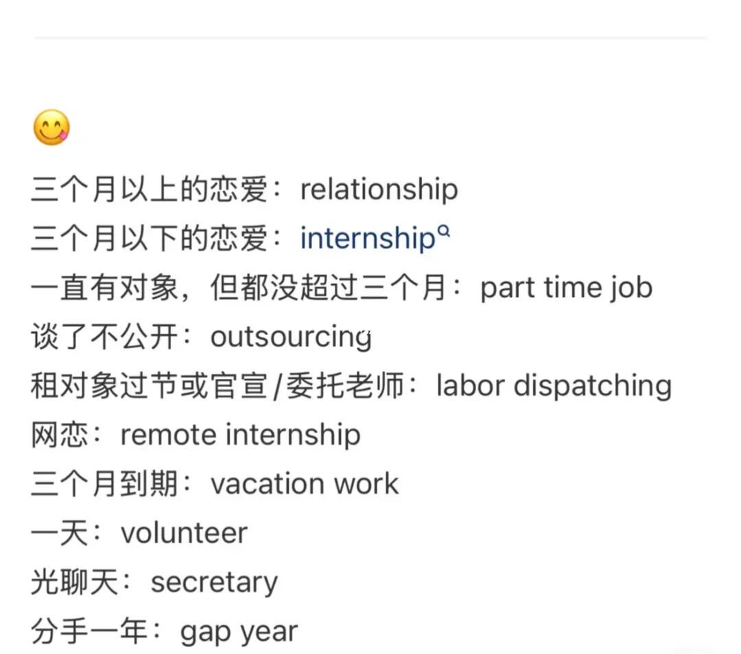- Situationship:尚未明确定义或正式承诺的恋爱关系或性关系,常存在于友谊和传统亲密关系之间的灰色地带。