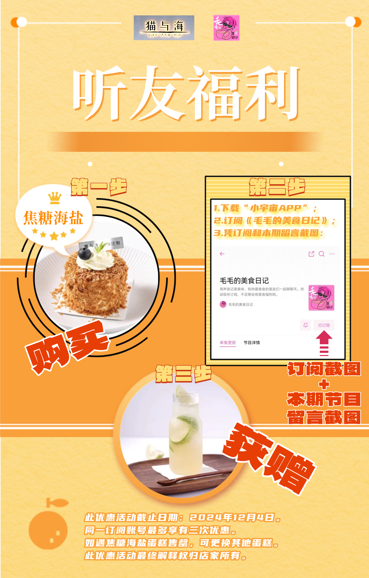 亲爱的听众朋友们,大家下载小宇宙APP并订阅《毛毛的美食日记》,在本期节目下方的评论区留言,凭订阅截图和本期节目留言截图,即可在“猫与海”的任意门店购买“焦糖海盐蛋糕”享受赠送“香水柠檬茶”的优惠。快来试试吧!