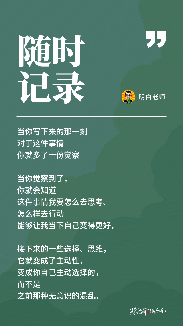 就有我会有一个习惯,就是我可能早上、中午、下午、晚上,我会每个时间段都抽出可能5分钟到10分钟,我记录一下我在做什么,我看了什么,我到底有什么样的想法,因为这些想法对应的其实会有一些情绪,可能是焦虑、可能是快乐、可能是嫉妒、可能是迷茫、可能是担心、可能是恐惧等等,这个就相当于写日记,不是说写出来要给别人看。