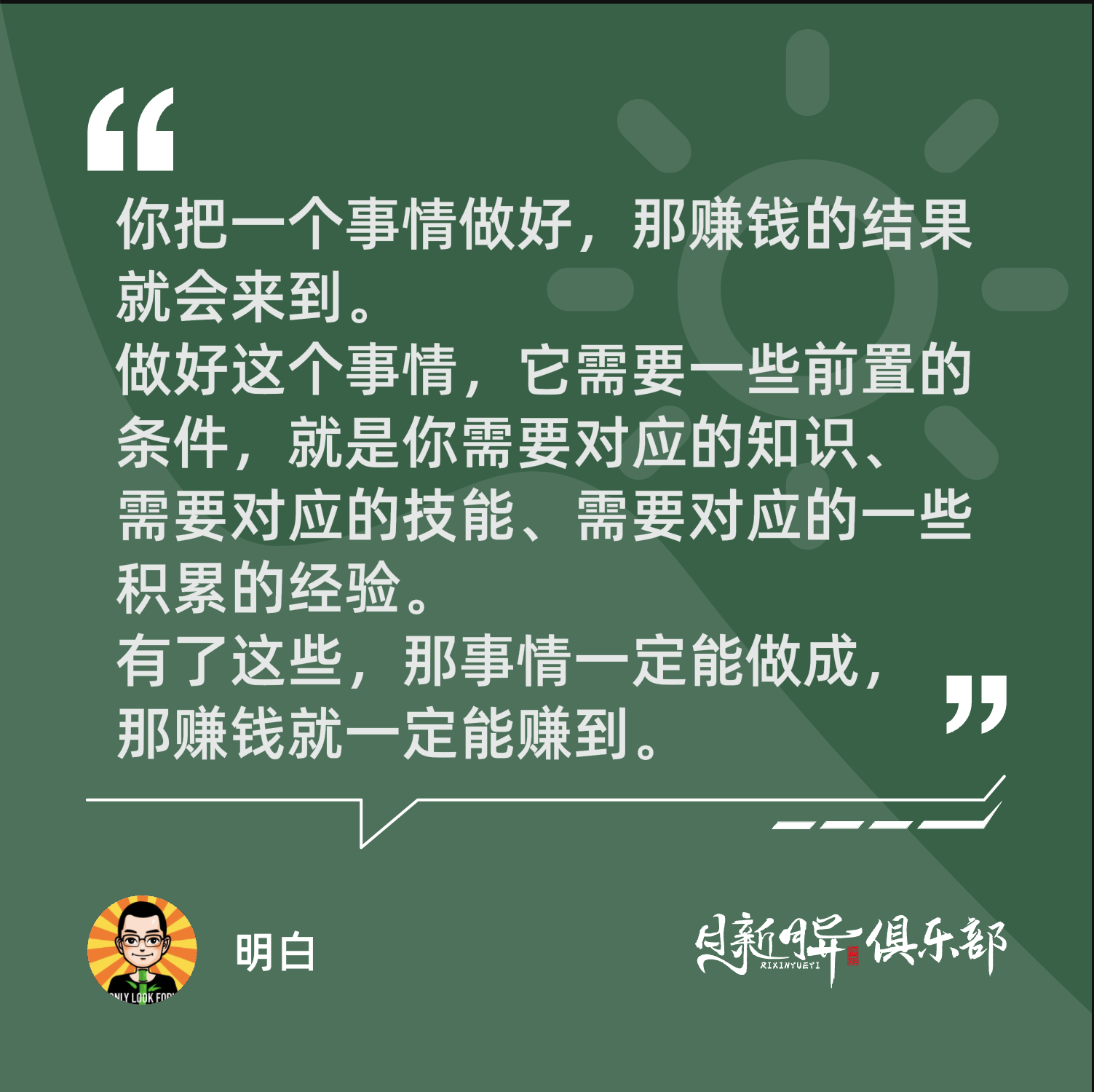 你把一个事情做好,那这个赚钱的结果就会来到。做好这个事情,它需要一些前置的条件,就是你需要对应的知识、需要对应的技能、需要对应的一些积累的经验。有了这些,那事情一定能做成,那赚钱就一定能赚到。