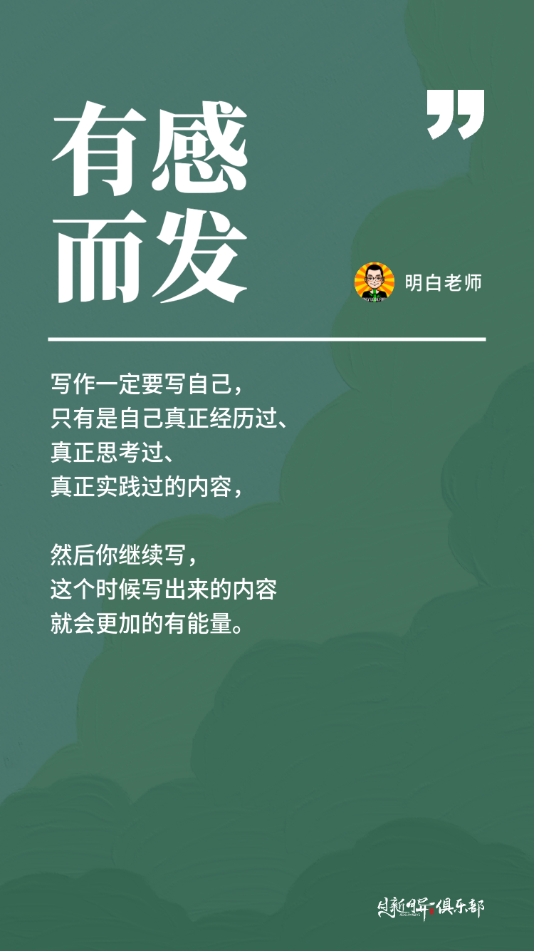 写作一定要写自己,只有是自己真正经历过、真正思考过、真正去实践过的内容,然后你继续写,这个时候写出来的内容就会更加的有能量。
