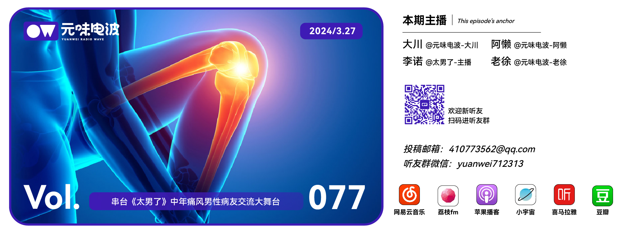 我们的节目,您可以在小宇宙、喜马拉雅、网易云音乐、荔枝 FM、荔枝播客,苹果播客,豆瓣书影音搜索「元味电波」来订阅、收听。如果喜欢我们,也可以分享给你身边的朋友!
