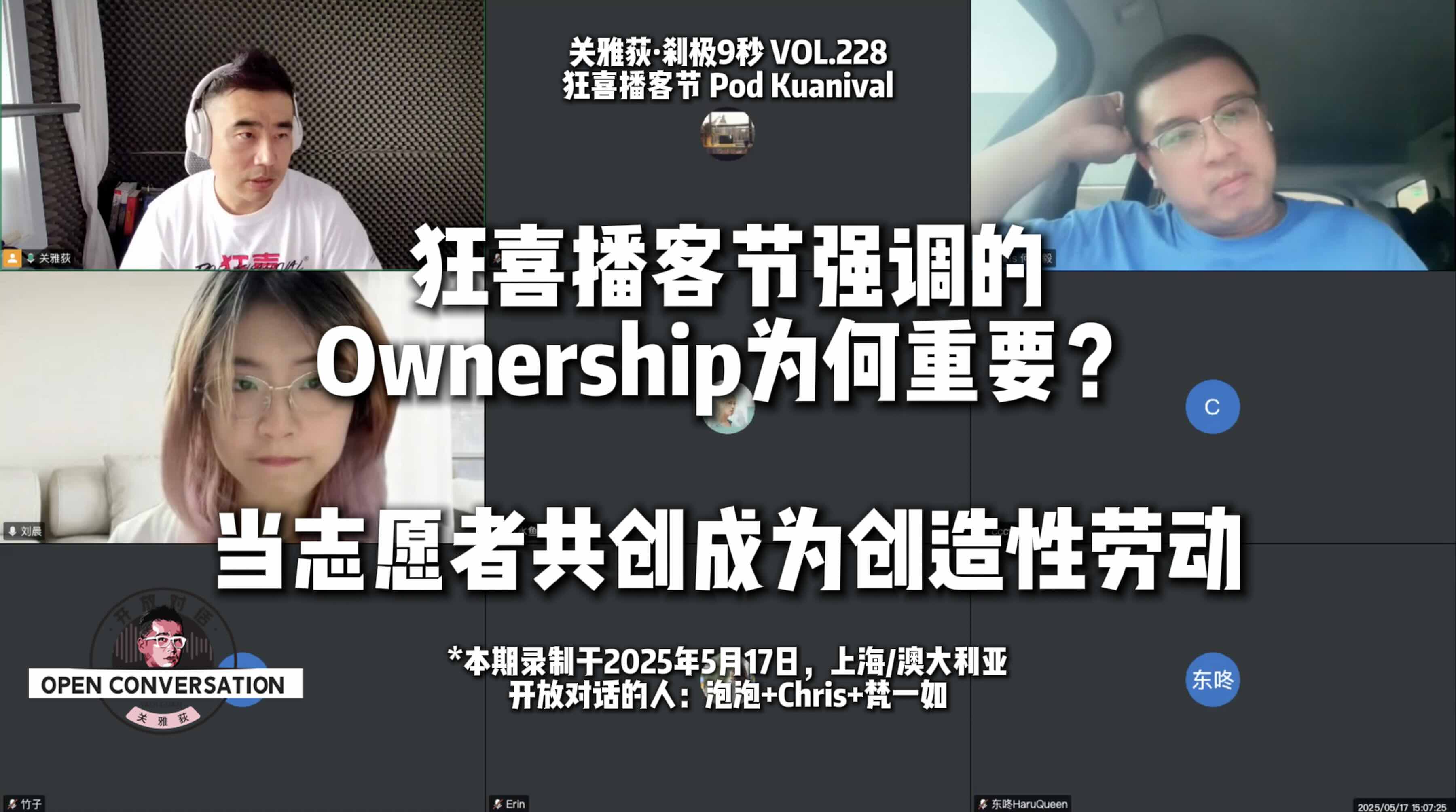 本期「关雅荻·刹极9秒」为第三届狂喜播客节「贰狂」的志愿者专题复盘。对谈人包括发起人关雅荻、联合创始人梵一如,以及两位志愿者嘉宾:从悉尼专程返沪参与的Chris(澳洲新州多元文化广播电台主播)和连续三届到场的泡泡(本届担任主播志愿者)。整期围绕志愿者的工作体验、现场观察、节目形态与组织方法,以及「去中心化」「自组织」的实践展开,兼及对未来形态、海外延伸与技术方案的想象与论证。