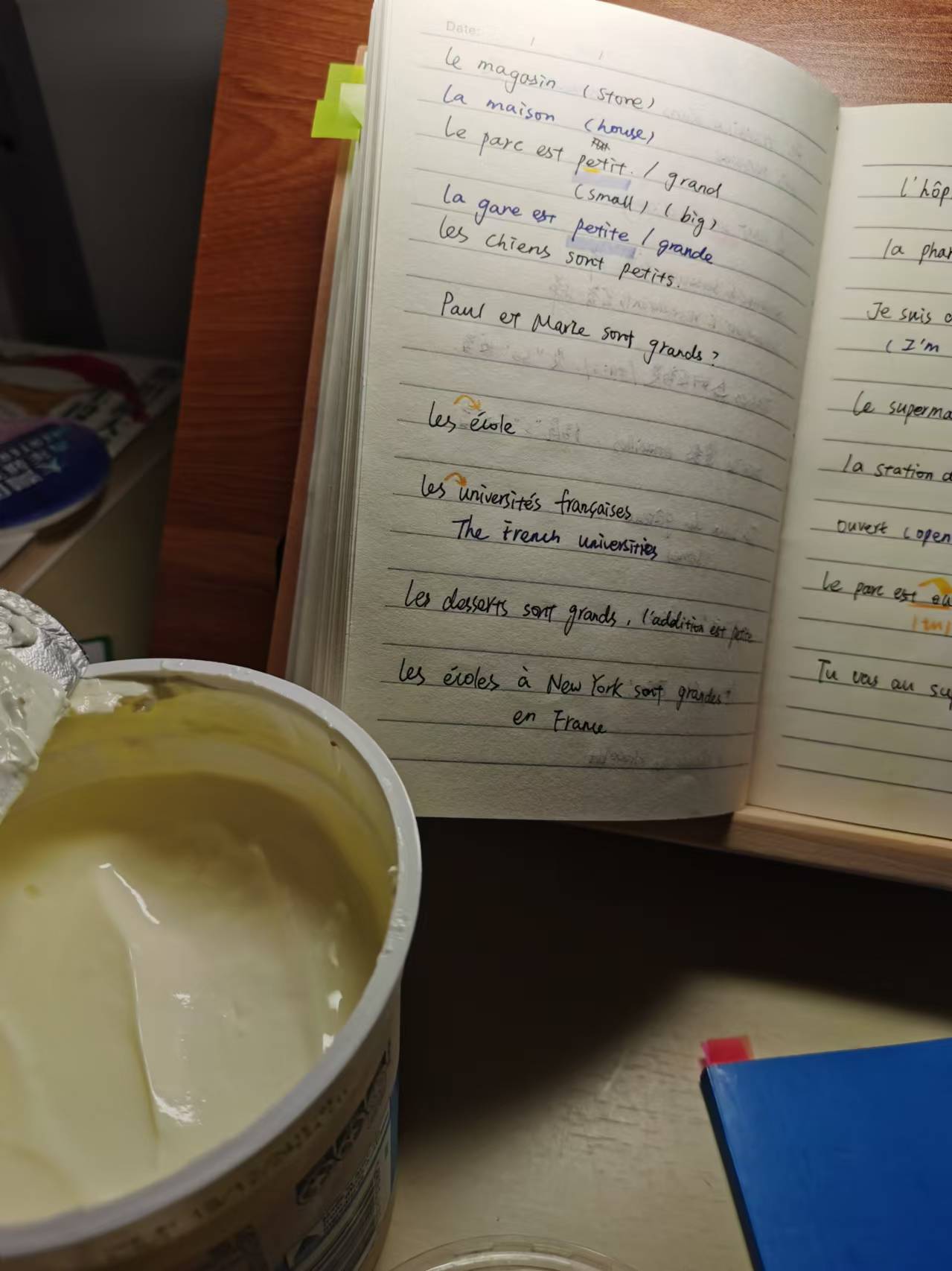 近来都是晚上锻炼完回到家学十几到半个小时不等的法语,昨晚边吃酸奶边学,美滋滋~