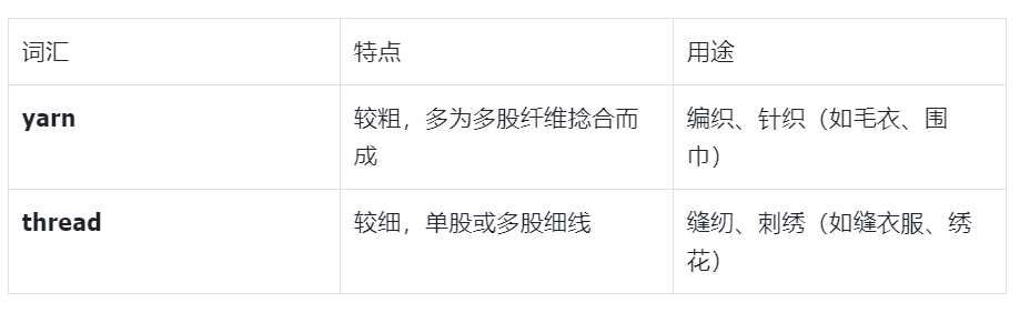 - 示例:The craft store sells a variety of yarns for different projects.(这家手工店售卖各种线,适用于不同的手工项目。)