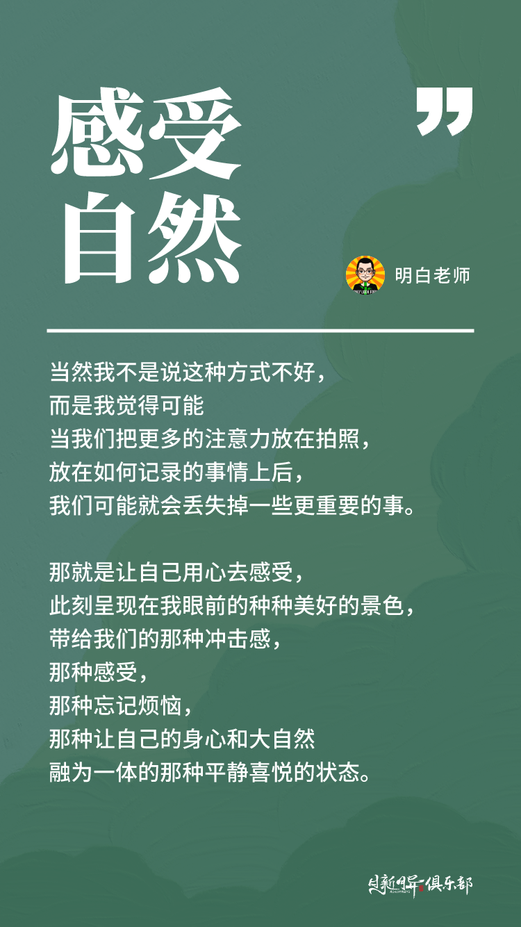 所以如果你可能周末呀或者说什么时候也去大自然,或者说去公园或者说去什么其他的地方去游玩,看到一些让你很有感触的然物,很有感受的景物。嗯,不要单纯只是拍照,还是要让自己真的去感受那个景色带给自己的很美好的感受。这个感受我觉得才是最重要的。