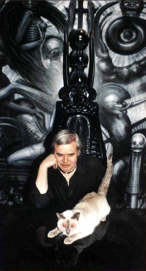 吉格尔在苏黎世机场旁的自宅餐厅里,面前桌上趴着他的宠物猫马季。背后是他的一幅名为“环境”的巨幅画作,而他正坐在为《沙丘》设计的哈肯尼宝座上。