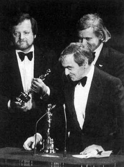 1980年奥斯卡颁奖典礼上的《异形》大佬们,左起:模型艺术家尼克·艾德尔、怪物道具艺术家卡尔罗•拉姆巴蒂、H.R. 吉格尔。