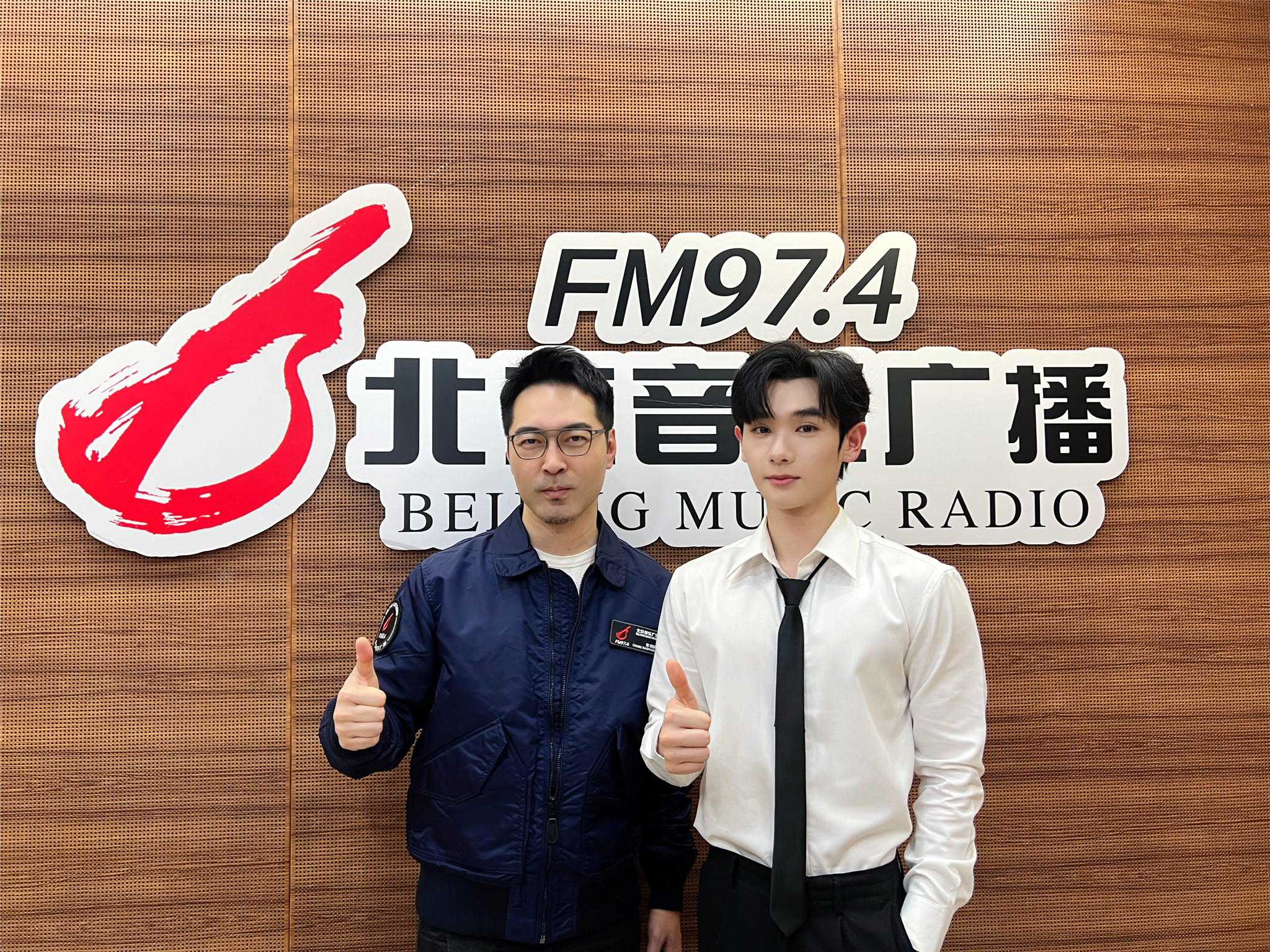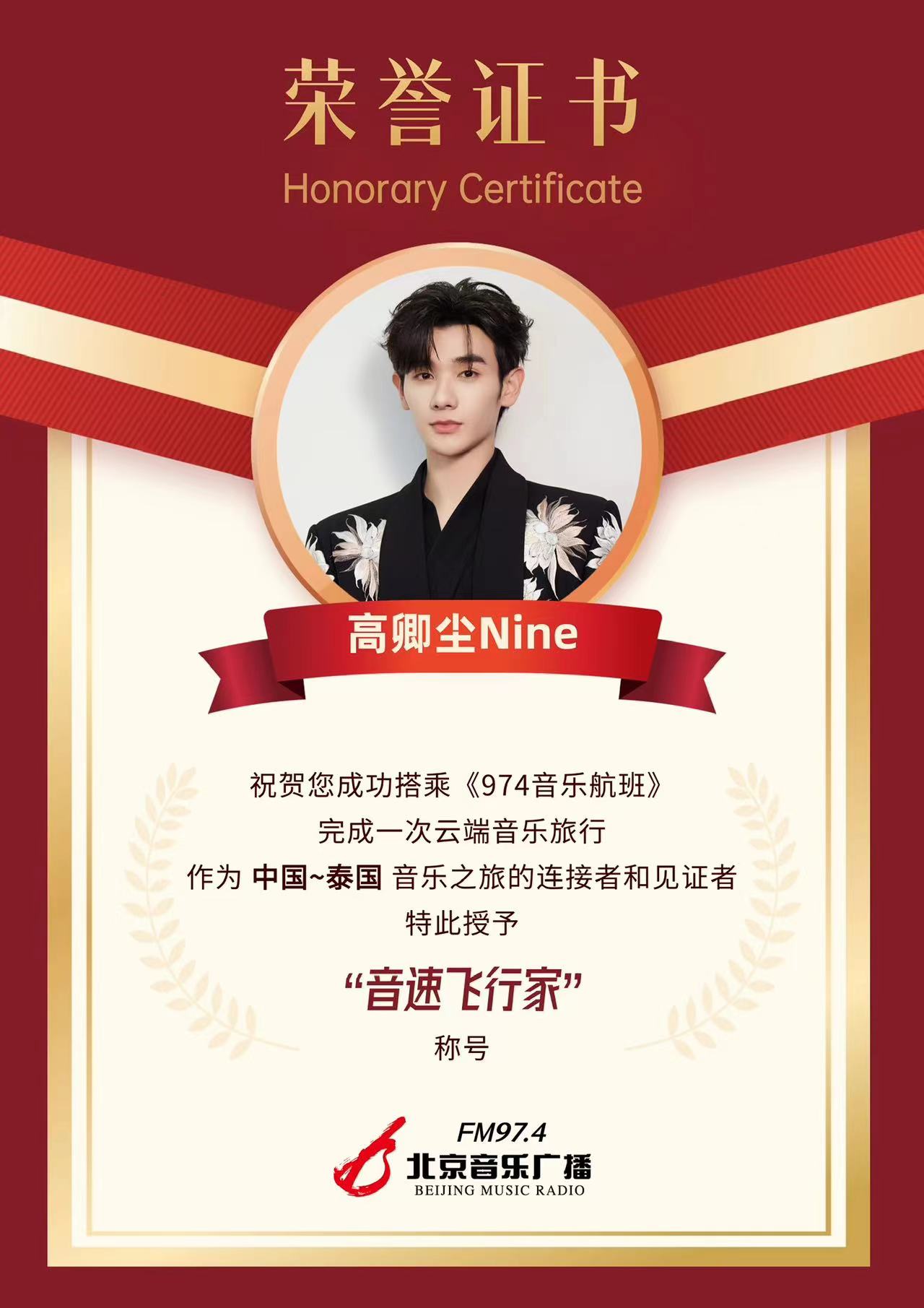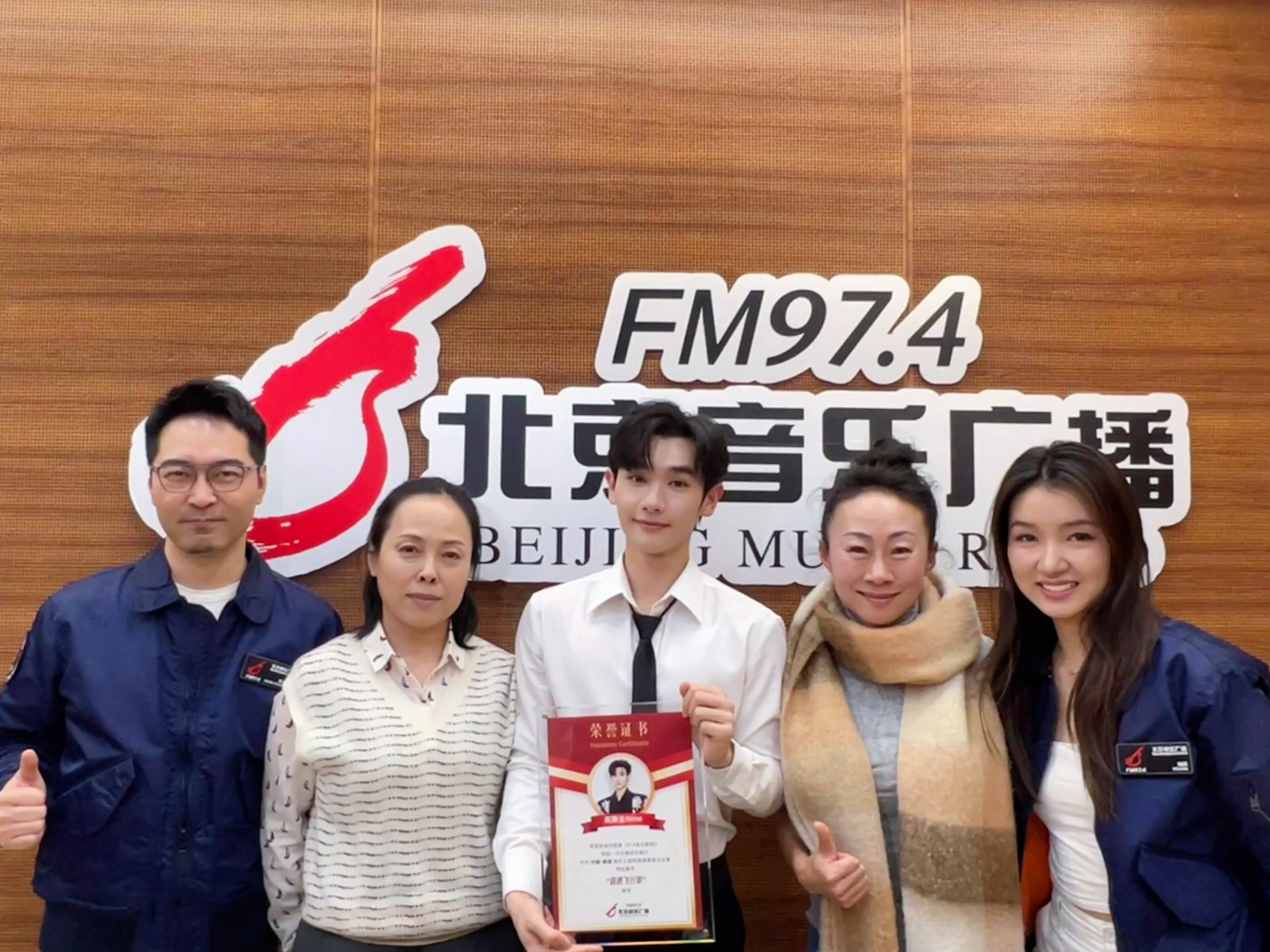 北京音乐广播领导与《974音乐航班》编播人员与高卿尘在节目中录制后的合影,为小九颁发“音速飞行家”称号荣誉证书。