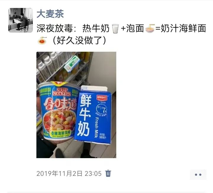 另外有一个不是因为泡面特别,而是我的吃法特别,这个做法我其实很小的时候,就有这样做,我还一直以为这是我的发明,那就是热牛奶泡海鲜面杯面,吃上去就像意大利海鲜面一样,这个是我觉得很特别的泡面。