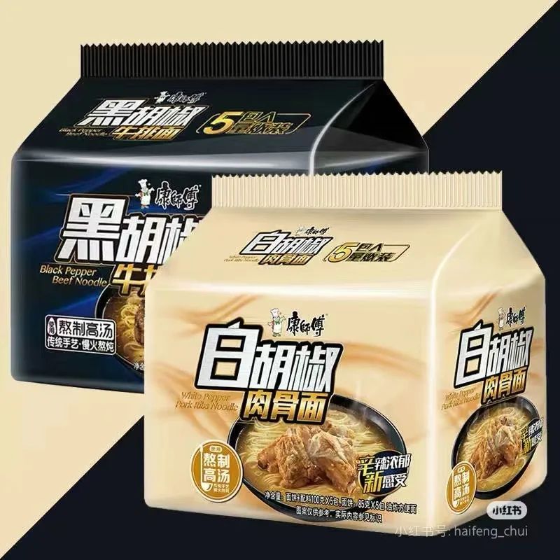 黑白胡椒系列自2016年上市,康师傅白胡椒肉骨面的已经于2019年10月之前下市了。同时下市的,还有黑胡椒牛排面和胡椒猪肚鸡面。2019年10月份上市了最新版的铁板牛排面,白胡椒猪肚面,接替之前的黑白胡椒系列。