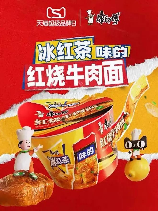 2023年10月13日,康师傅联合“天猫超级品牌日”,推出新品康师傅冰红茶味的红烧牛肉面。以新品为核心组成的“内个味儿”全家桶,发售5分钟即售出1000份,不到半小时售罄。