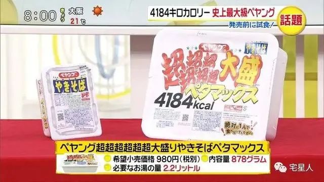 日常买的方便面,一般一包都只有100克左右,世界上最大的方便面是来自日本超超超大盛泡面,一盒重达到878克,是普通方便面的8倍还要多,总卡路里达到4184卡,而一个成年人每日仅需要摄入大概2000卡路里,够一个成年人两天的能量摄入了。
