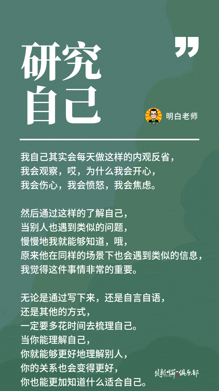 我自己其实会每天做这样的内观反省,我会观察,哎,为什么我会开心,我会伤心,我会愤怒,我会焦虑。然后通过这样的了解自己,慢慢地我就能够,当别人也遇到类似的问题,我就能够知道,哦,原来他在同样的场景下也会遇到类似的信息,我觉得这件事情非常的重要。
