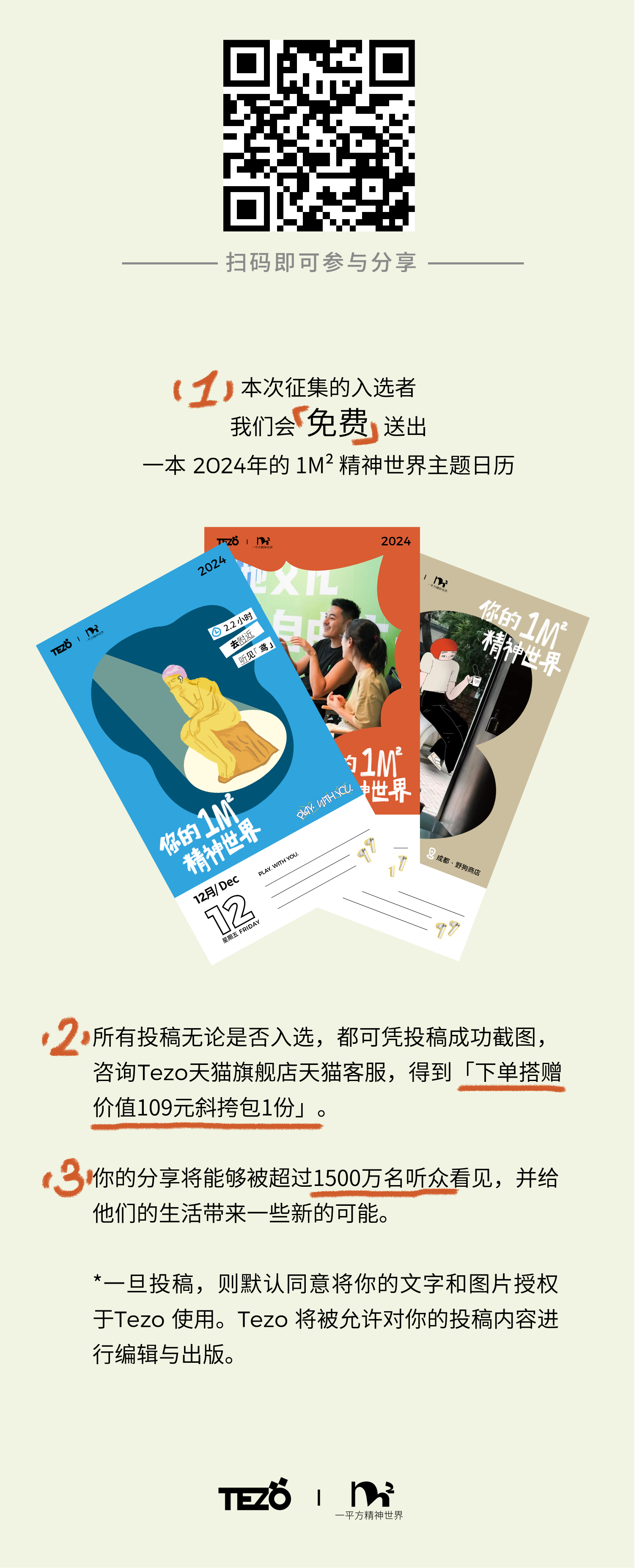 📍在评论区分享一直想要做,但是没有时间做的事情,或者听完这期节目之后,准备在自己每天的整块时间里面着手开始要去做的事情,走心的评论将有机会被Tezo的官方选中,获得2024年的一平方精神世界日历!