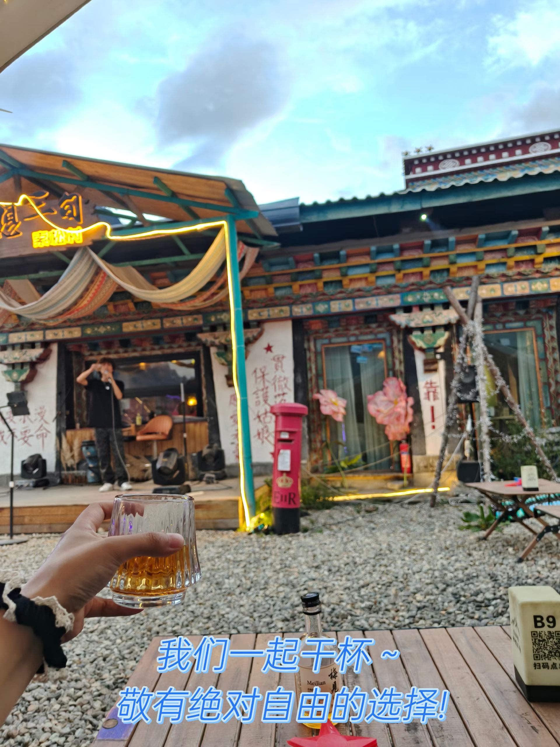 就是这样发现《理想三旬》的,首先店名就很吸引我,给孩子们讲的最多的是理想,那大了的我们呢?还有比我们更大的我们呢?其次是歌声,这里面传出来的声音让我眼睛一亮,好听,好有力量。顺着彩绘的台阶上去,脚踩在铺满碎石头的院子里,抬头一看,在藏族碉房的前面用木板铺了一个小舞台,舞台上站着一个黄毛卷发个子不高瘦瘦的歌声正在试麦,左边雪白的墙上用粉色颜料写着“我要浪漫,我不要命”,右边写着“贯彻落实保护姑娘,愿爱无忧”。