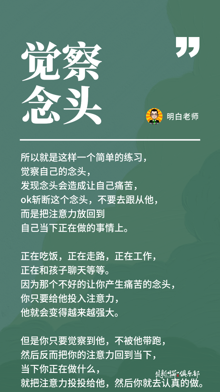 所以就是这样一个简单的练习,觉察自己的念头,发现念头的会造成让自己痛苦。ok斩断这个念头,不要去跟从他,而是把注意力放回到自己当下正在做的事情上,正在吃饭。正在走路,正在工作,正在和孩子聊天等等。因为那个念头那个不好的让你产生痛苦的念头,你只要给他投入注意力,他就会变得越来越强大。