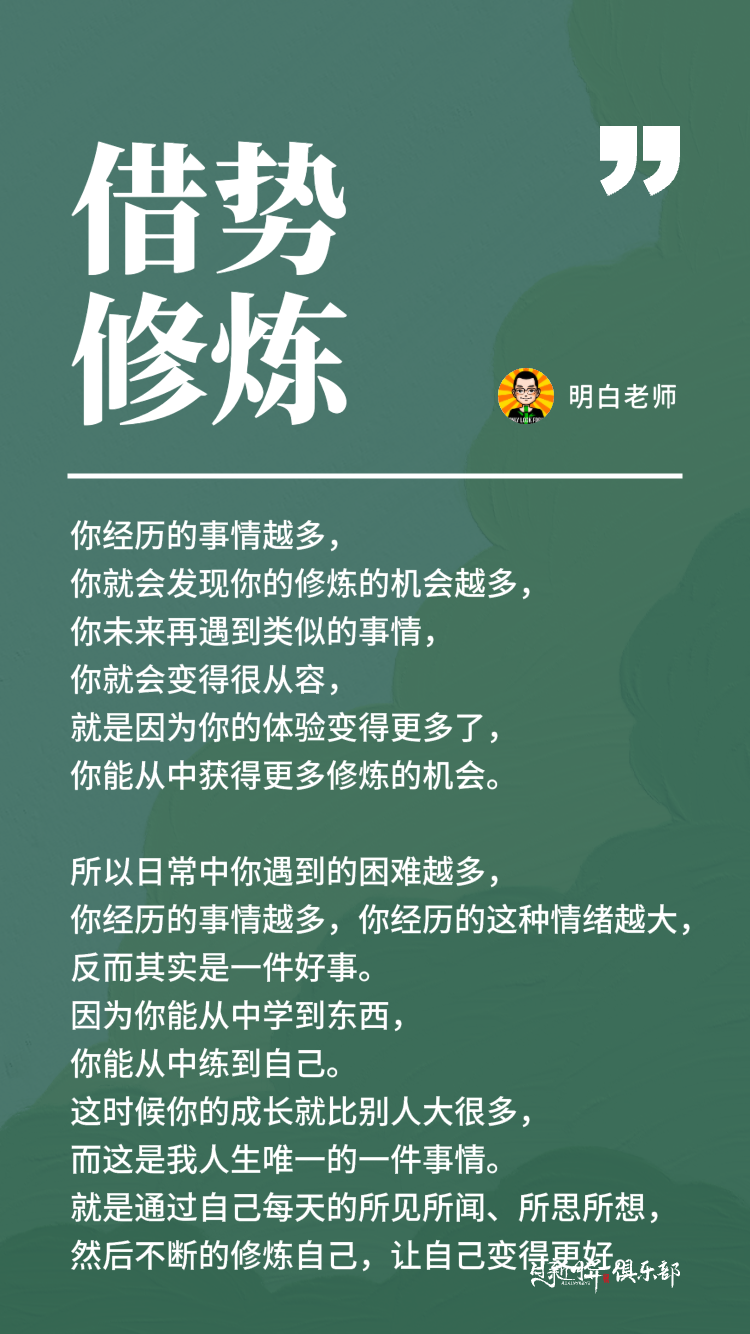 然后在这个过程中,你发现了更多不一样的自己。然后你在这个过程中,你又不断的去修炼,不断的让自己能够体验到更多不一样的人事物,学到更多不一样的为人处世的方式,让自己的心性,让自己的智慧都变得更多。这时候你才是一个更加了不起的自己,你在借势修炼。