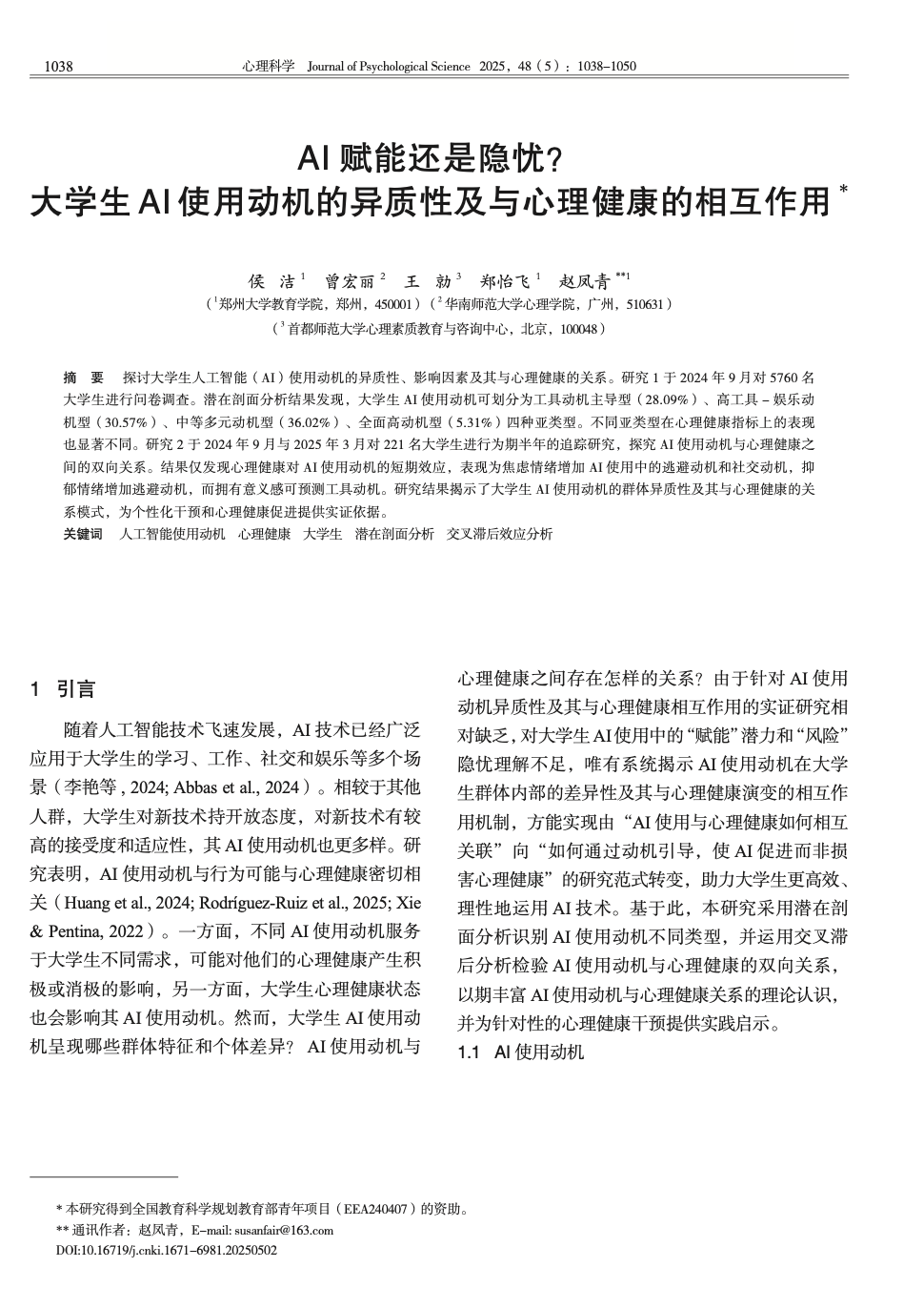 AI使用动机、大学生心理健康、工具动机、逃避动机、社交动机、拟人化、心理咨询
