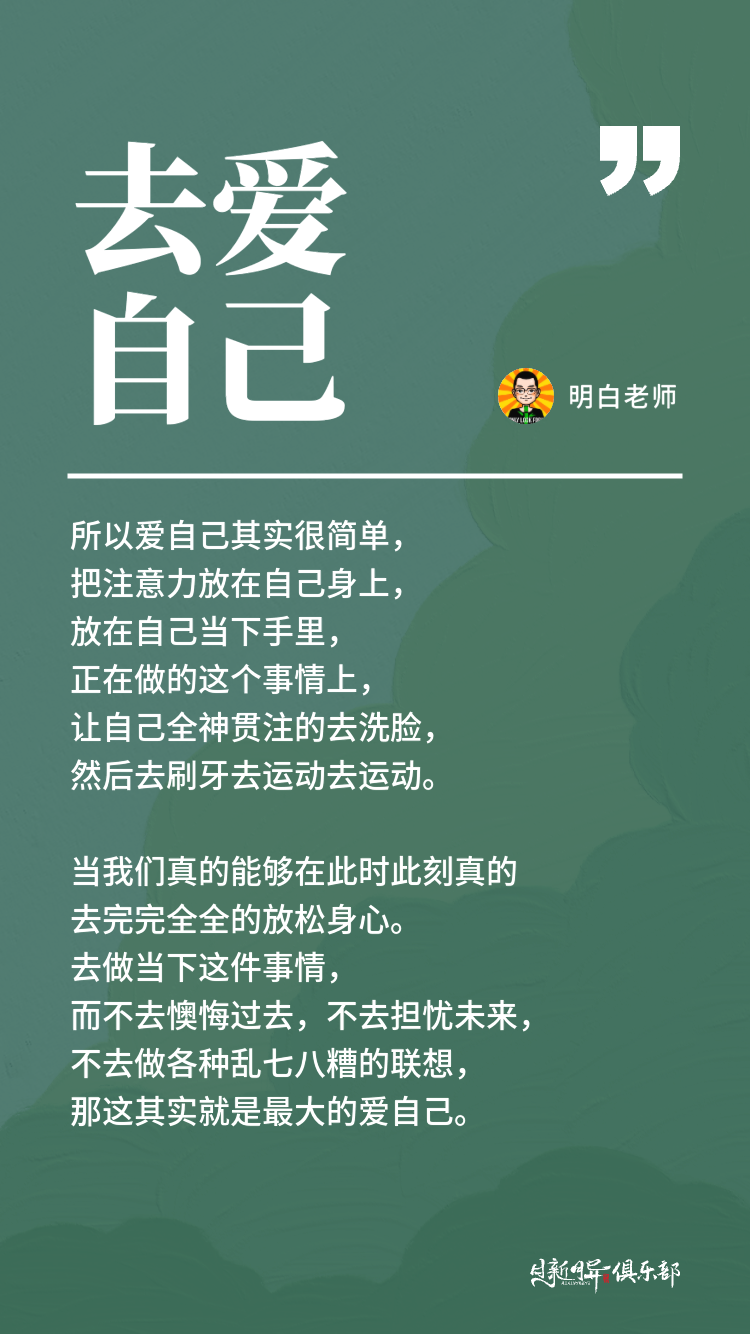 所以爱自己其实很简单,把注意力放在自己身上,放在自己当下手里,正在做的这个事情上,让自己全神贯注的去洗脸,然后去刷牙去运动去运动。当我们真的能够在此时此刻真的去完完全全的放松身心。去做当下这件事情还,不去懊悔过去,不去担忧未来,不去做各种乱七八糟的联想,那这其实就是最大的爱自己。