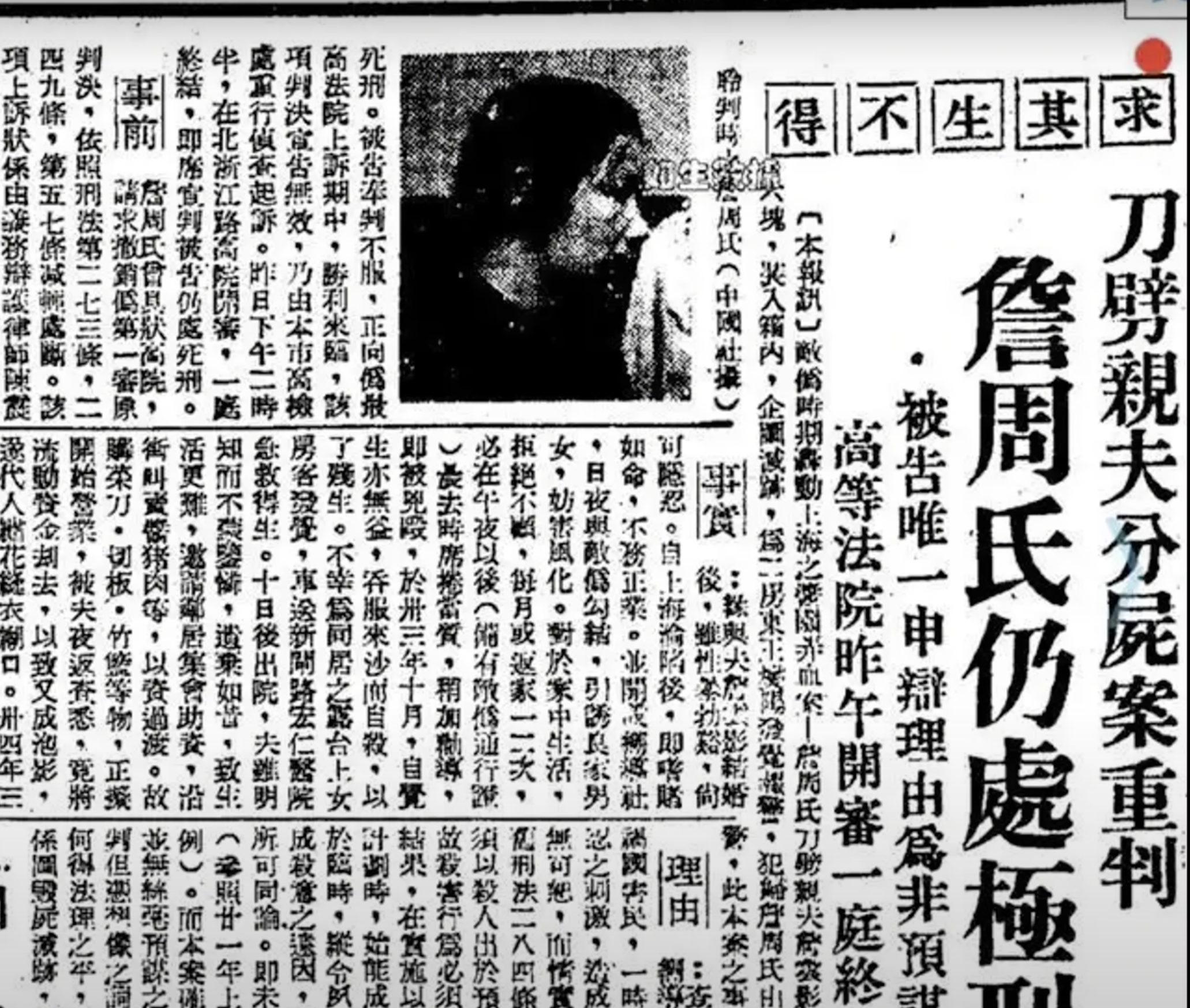 1945年3月20日,上海新昌路酱园弄85号发生的一起骇人听闻的命案,被誉为民国四大奇案之一。 早上6点多钟,外号大块头的租客詹云影被其妻詹周氏用菜刀所杀,遭其分解后被装入家里的皮箱中,因血迹滴到楼下,被居住楼下的二房东夫妇发现,随即报警缉拿。
