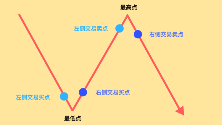 最后做个简单总结:一段交易的开始永远是“买入”,而左侧交易的买点一直在股价最低点的左边,而右侧交易的买点是在最低点的右边。那么一段交易的结束是以“卖出”为准,左侧交易的卖点同样在股价最高点的左边,而右侧交易的卖点在最高点的右边,这就是左侧交易和右侧交易的由来。