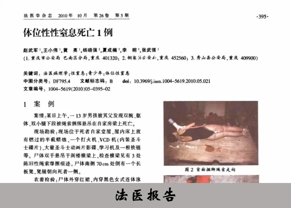 2.赵武军,王小伟,黄亮,杨晓强,夏成楠,李明,张武强.体位性性窒息死亡1例[J].法医学杂志,2010,26(05):395-396.
