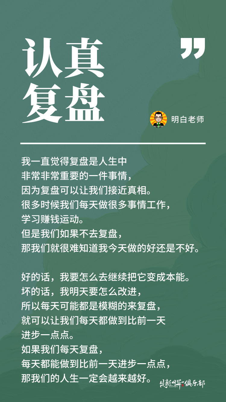 好的话,我要怎么去继续把它变成本能。坏的话,我明天要怎么改进,所以每天可能都是模糊的来复盘,就可以让我们每天都做到比前一天进步一点点。如果我们每天复盘,每天都能做到比前一天进步一点点,那我们的人生一定会越来越好,这是确定一定以及肯定的。