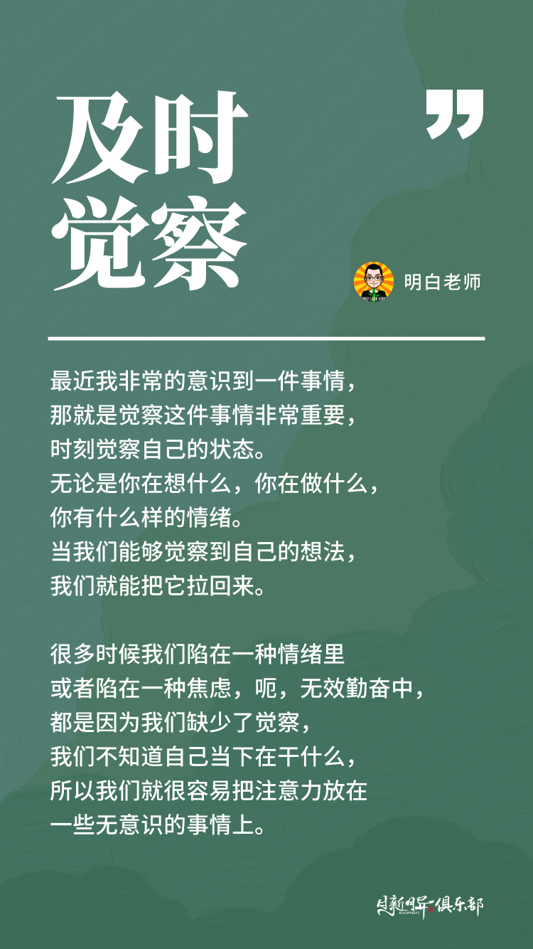 很多时候我们陷在一种情绪里或者陷在一种焦虑,呃,无效勤奋中,都是因为我们缺少了觉察,我们不知道自己当下在干什么,所以我们就很容易把注意力放在一些无意识的事情上。