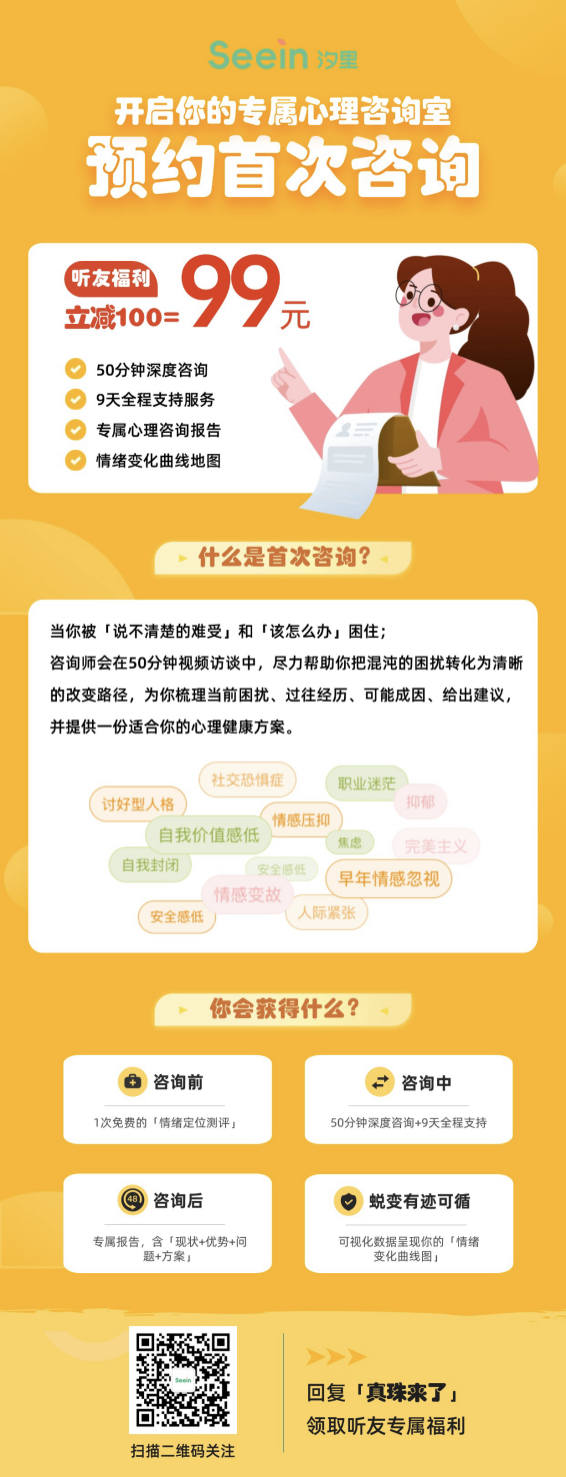搜索并关注「汐里心理」公众号,回复关键词【真珠来了】,即可领取【199-100的首次咨询优惠券】,立享 99 元低价首次咨询福利~