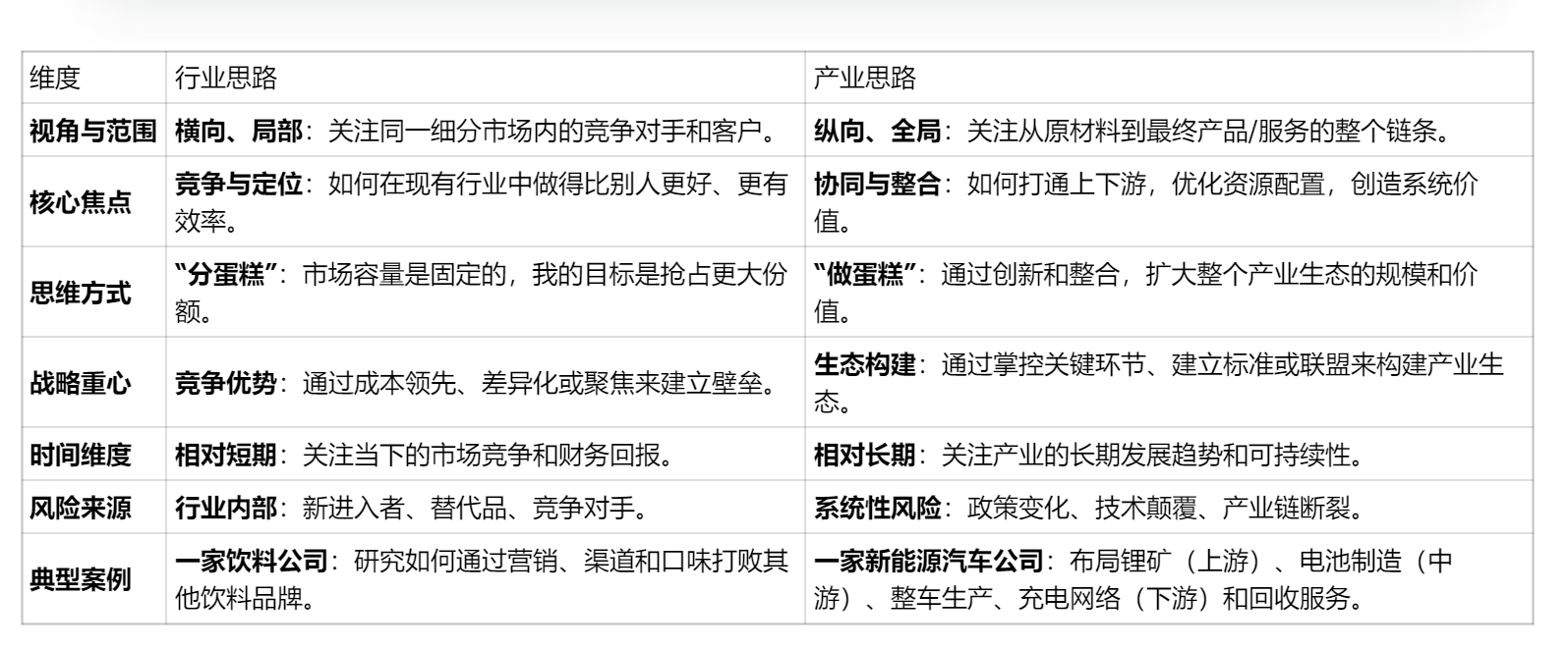 - 产业思路是“做蛋糕”的思维:关注如何构建和优化从源头到终端的整个价值链条,甚至创造新的市场。