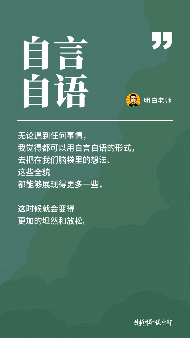 所以无论遇到任何事情,我觉得都可以用自言自语的形式,去把在我们脑袋里的想法,这些全貌都能够展现得更多一些,这时候就会变得更加的坦然和放松。