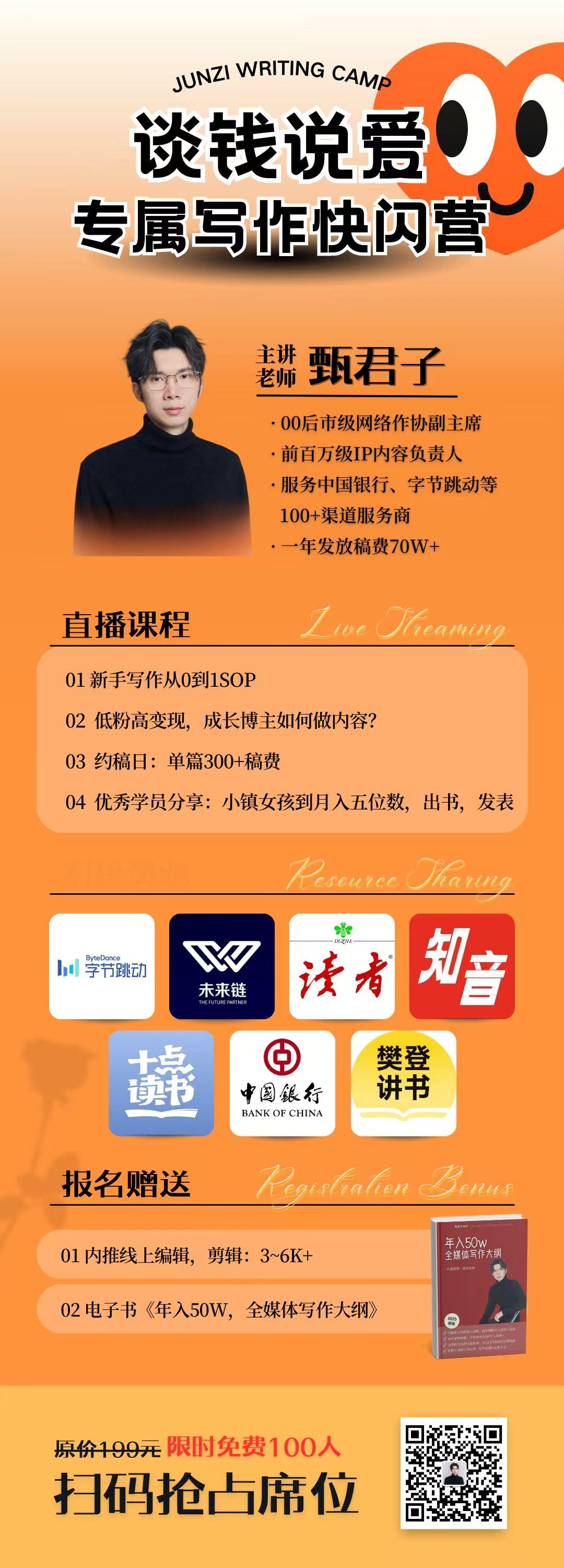 👉 前100位听友专属:免费参加「实战写作训练营」(扫码领取),君子亲自带练4天直播!