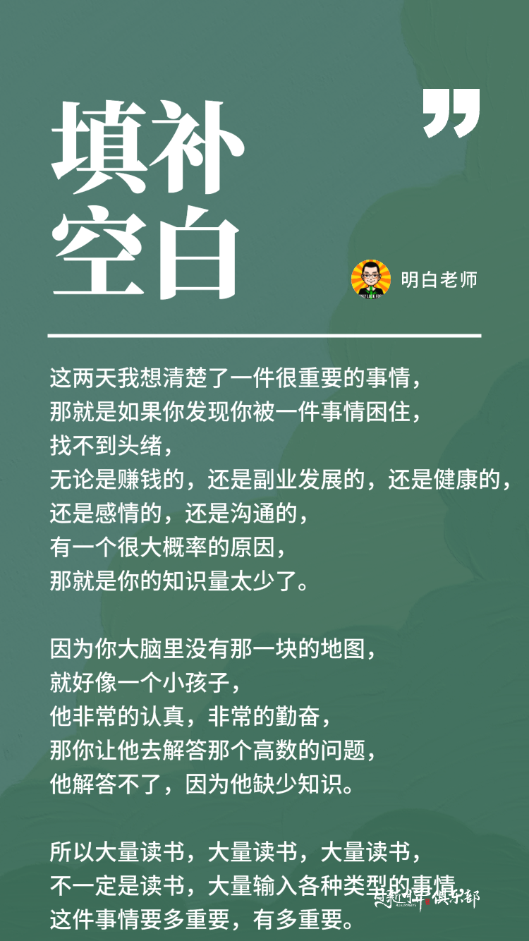 这两天我想清楚了一件很重要的事情,那就是如果你发现你被一件事情困住,找不到头绪,无论是赚钱的还是副业发展的,还是健康的,还是感情的,还是沟通的,有一个很大概率的原因,那就是你的知识量太少了。