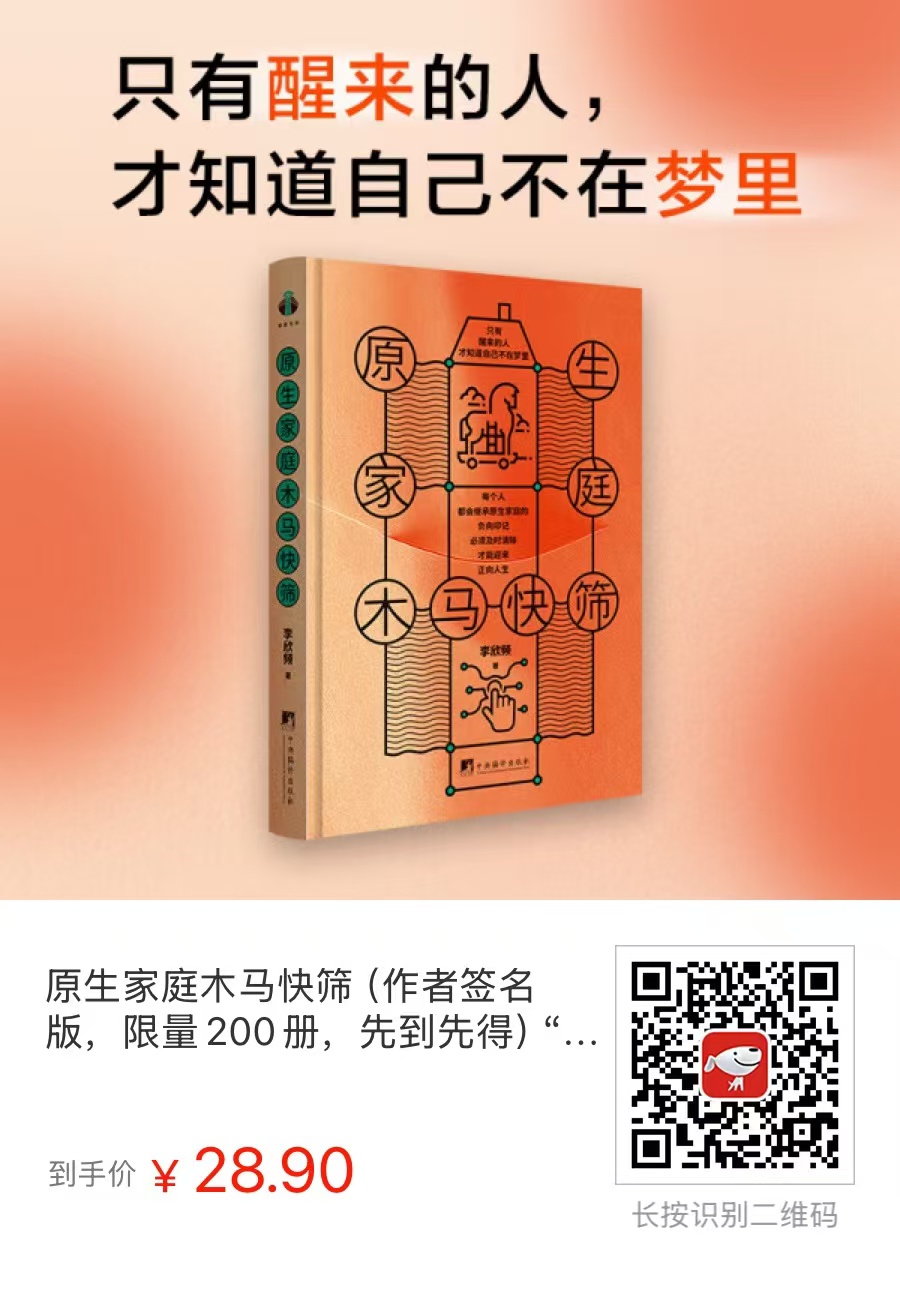 分享你这本,我非常喜欢的书《原生家庭木马快筛》,李欣频老师深入剖析原生家庭对我们的影响,就像电脑中了木马程序病毒一般,原生家庭中的某些问题可能会让我们的人生卡顿、指令混乱,这本书教会我们如何筛查并清除这些木马,挣脱束缚,18 岁以后的我们,有力量生长出一个新的自己。点击链接或扫码下方图片购买