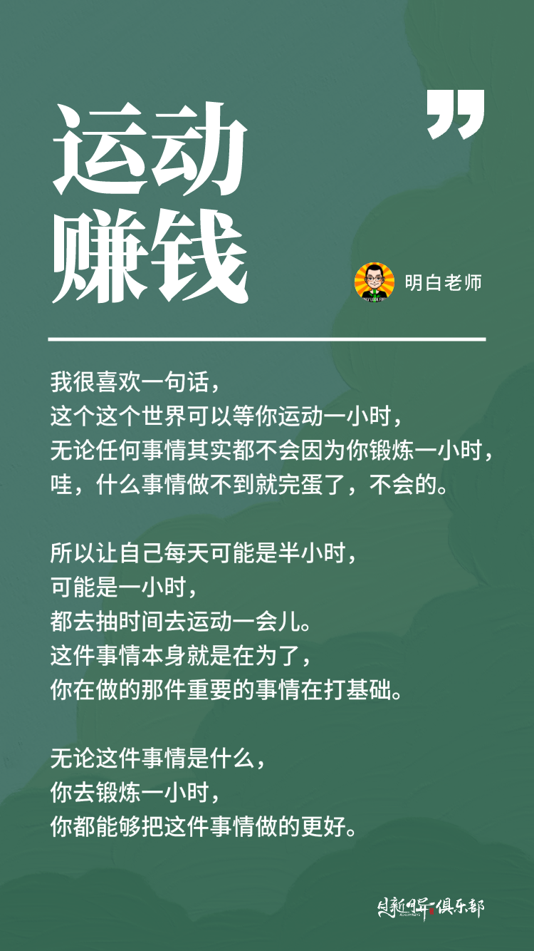 我很喜欢一句话,这个这个世界可以等你运动一小时,无论任何事情其实都不会因为你锻炼一小时,哇,什么事情做不到就完蛋了,不会的。
