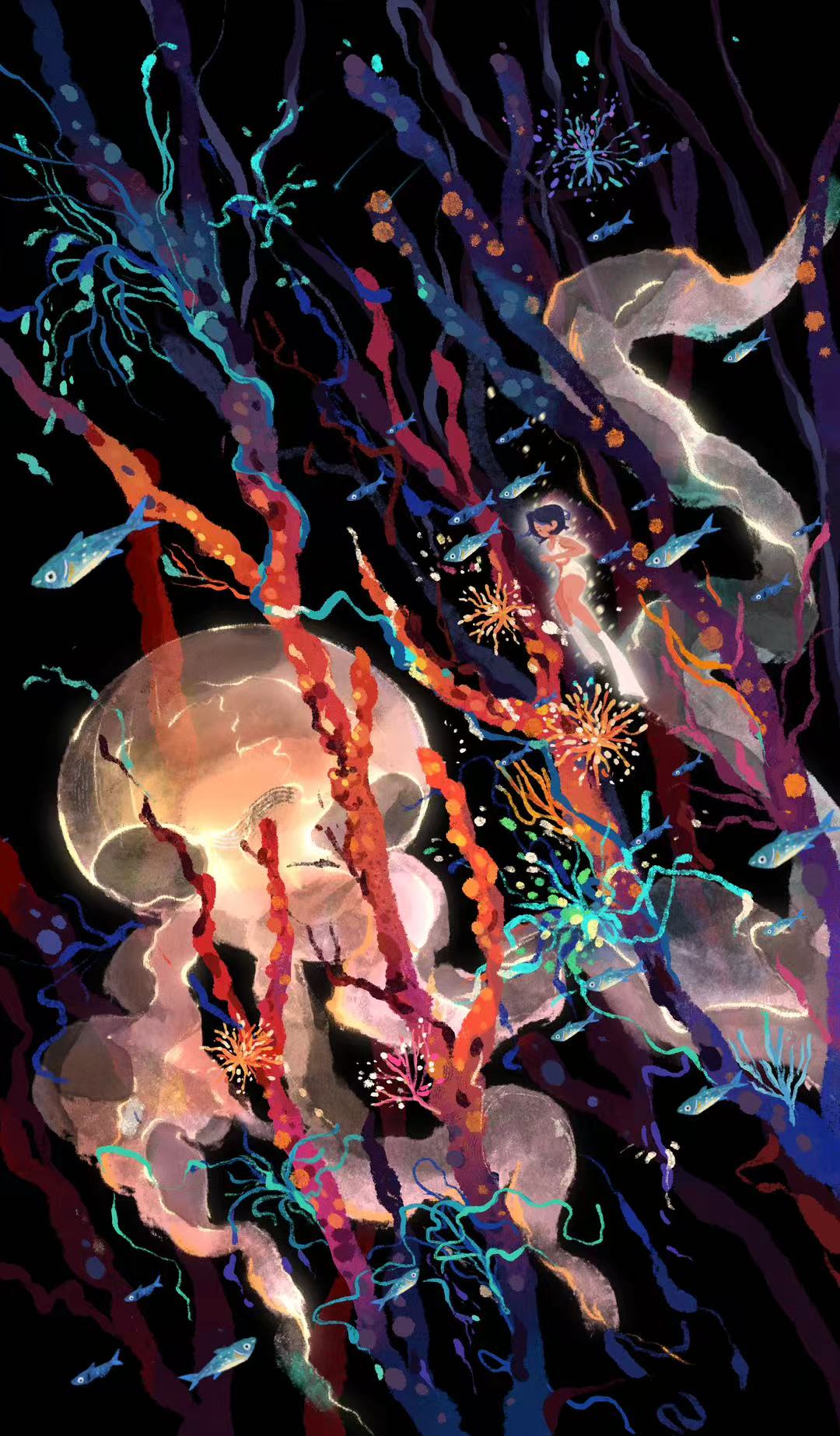 水母觉得,创作好的作品,不是靠一味钻研绘画技术或者追求风格,而是靠强大的生命力。她鼓励大家多去尝试和探索,因为机会常常藏在那些你没想到的地方。面对AI的快速发展,她一点也不担忧,因为她相信,综合能力,学习能力才是让人走得更远的关键。