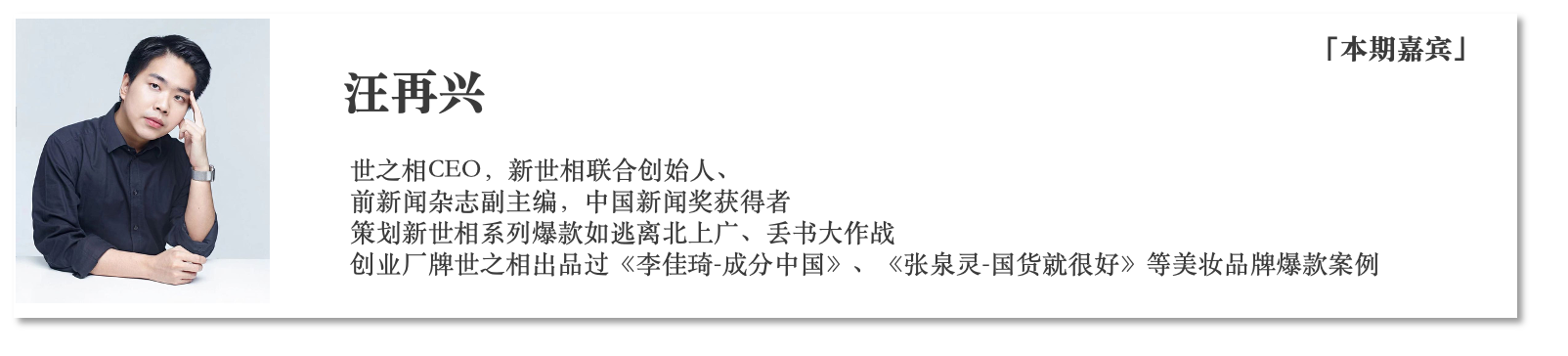 我们从他的职业履历聊起,关于他采访的马斯克、昂山素姬,到后面创业做新世相,怎么做出一系列大爆款,再聊到他创立的新厂牌[世之相],怎么看美妆行业,怎么和李佳琦做爆款。他其实作为一个记者出身的人还是会忍不住“反客为主”给我一顿灵魂拷问,我其实聊完还是觉得后劲蛮大的