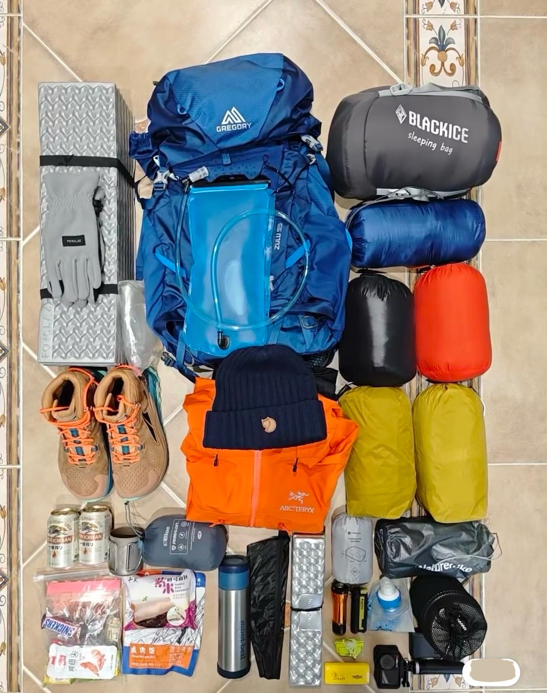 登山杖(两根!下山保膝盖)、冲锋衣(保命!选亮色出片)