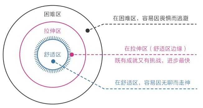 《认知觉醒》中提到的学习能力或成长可以分为三个部分:舒适区、拉伸区和困难区