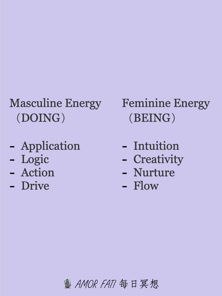 今天想聊关于feminine energy and masculine energy,阴性能量和阳性能量,或者说是宇宙法则之一的law of gender,很多人会浅显的认为阴性能量要与阳性能量结合才完整放在现实生活里就是男人需要女人,女人需要男人,事实上,如果你只在女人身上寻找女性特质,而在男人身上寻找男性特质,那么世界上便只有男人和女人,那请问人去哪里了呢?男性要在自己的身上寻找女性特质,找到它并认识它,因为每一个人,你从一开始就同时拥有着阳性能量与阴性能量。