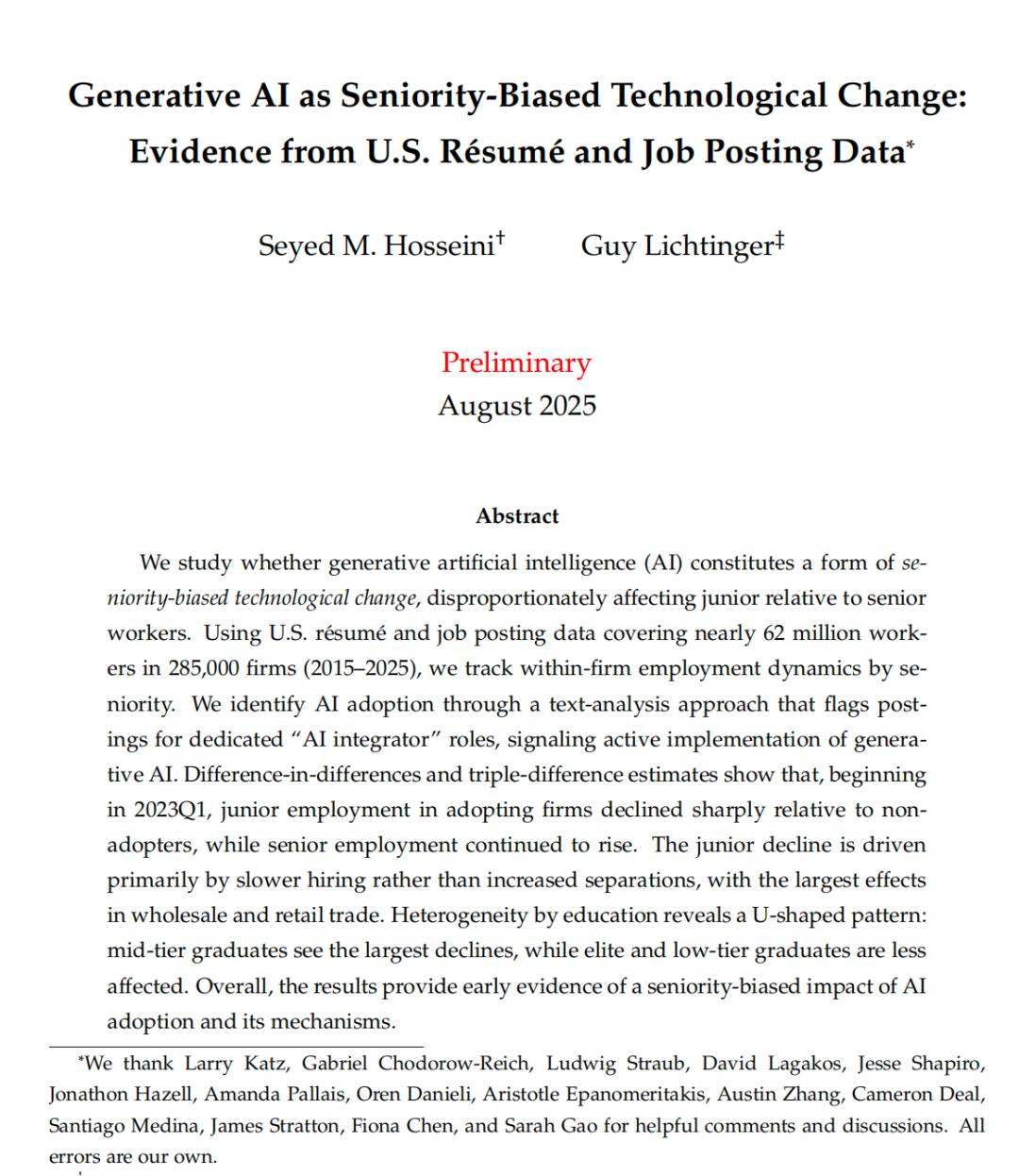该分析基于一篇由哈佛大学经济学博士生Seyed M. Hosseini和Guy Lichtinger撰写、由劳动经济学权威拉里·卡茨(Larry Katz)指导的论文。研究以其严谨的论证和庞大的真实数据为基础,冰冷客观地剖析了AI对就业市场的具体影响。