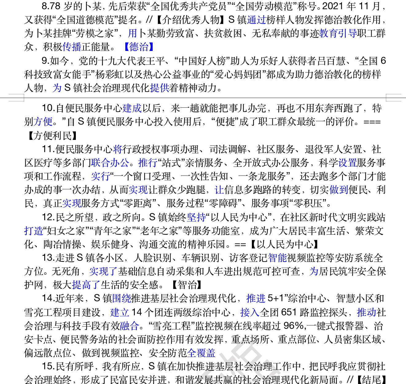 一,政治。统筹各单位,划分网格,相互嵌入。打通神经末梢,利用阵地开展宣传教育活动,讲解案件,增强意识。坚持以人民为中心,建成便民服务中心,实现联合办公设置事项和流程,实现一次办结,实现便民利民。同时打造服务功能室,促进基层社区和谐繁荣。