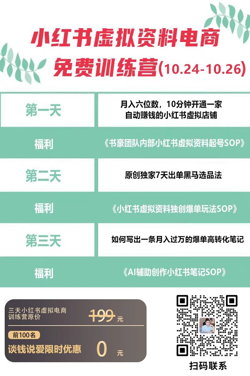 福利二: 原价199元【从0到1学会小红书虚拟电商】3天直播训练营免费参加资格!手把手带你入门。