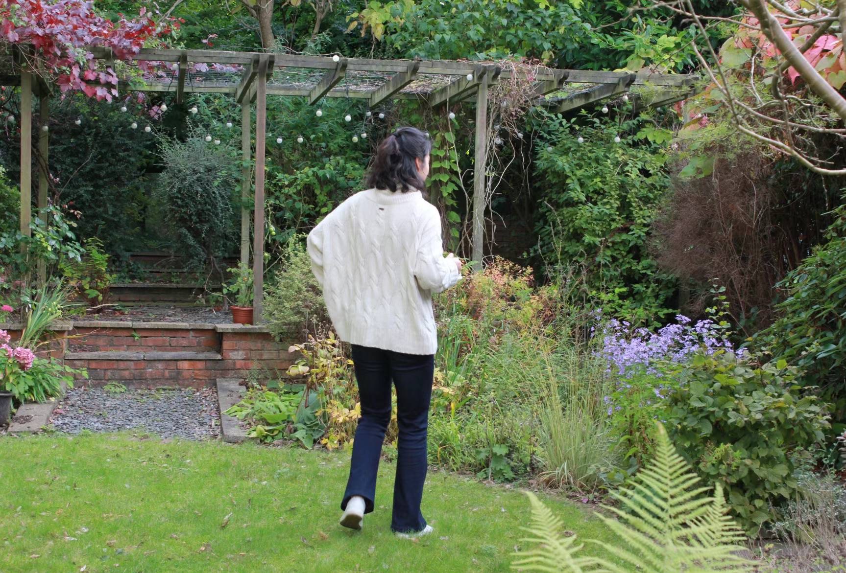 (Helen在英国家里的花园散步)