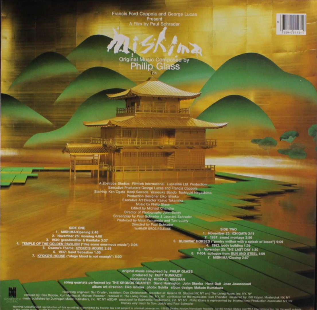Philip Glass创作了诸多极有影响力的电影配乐,比如《楚门的世界》、《时时刻刻》、《三岛由纪夫:人间四幕》等,深刻影响了后来的好莱坞电影及美剧的配乐。《三岛由纪夫: 人间四幕Mishima: A Life in Four Chapters》也是一部极为惊艳的传记片,交错呈现三岛的人生片段及其文学著作中的理想,格拉斯的配乐与这部电影相得益彰。