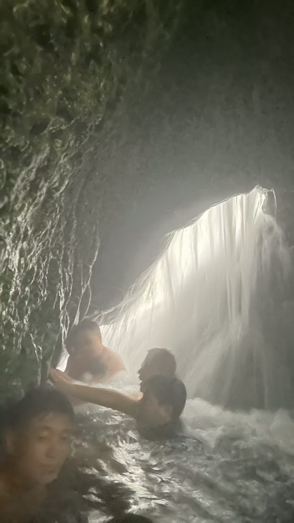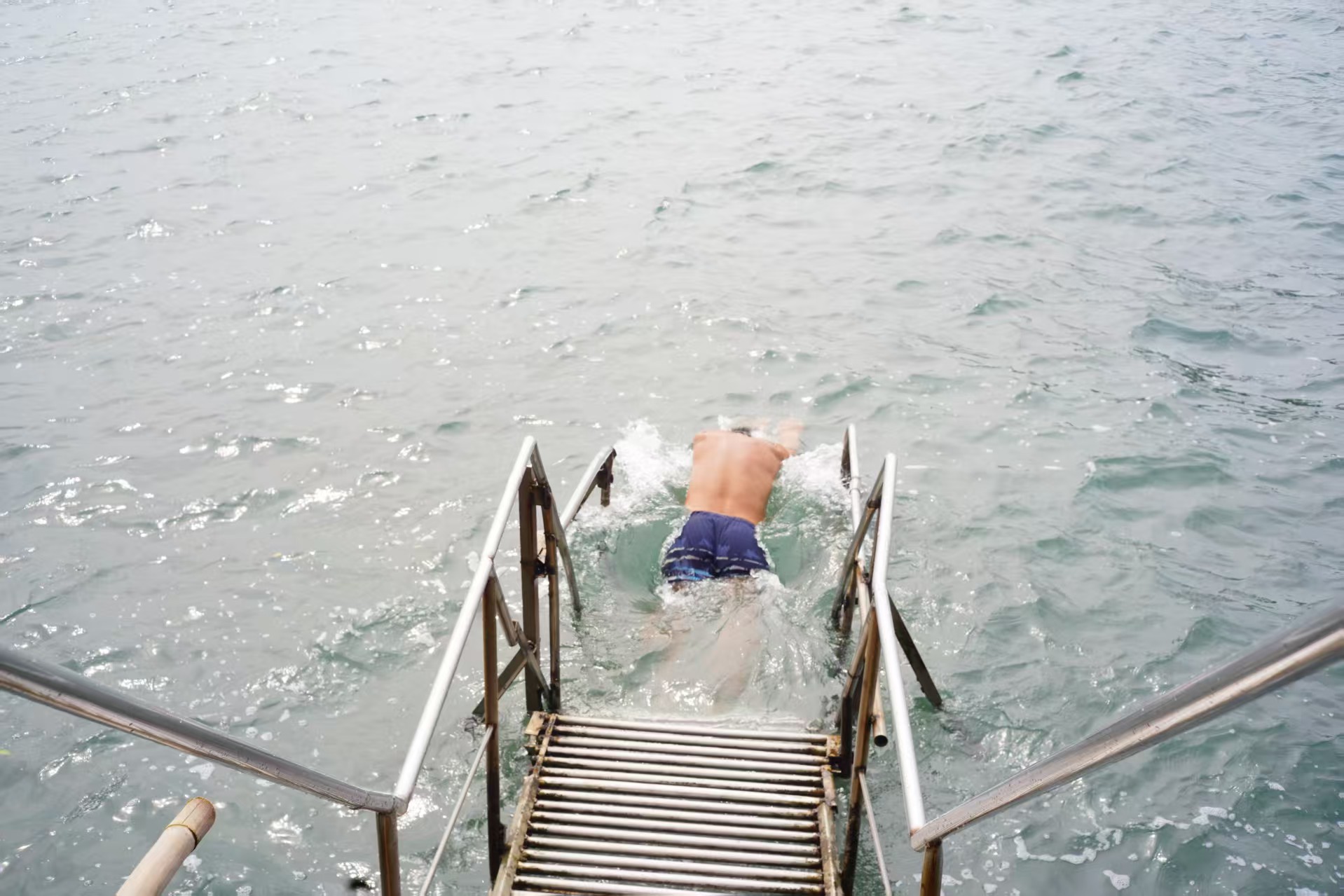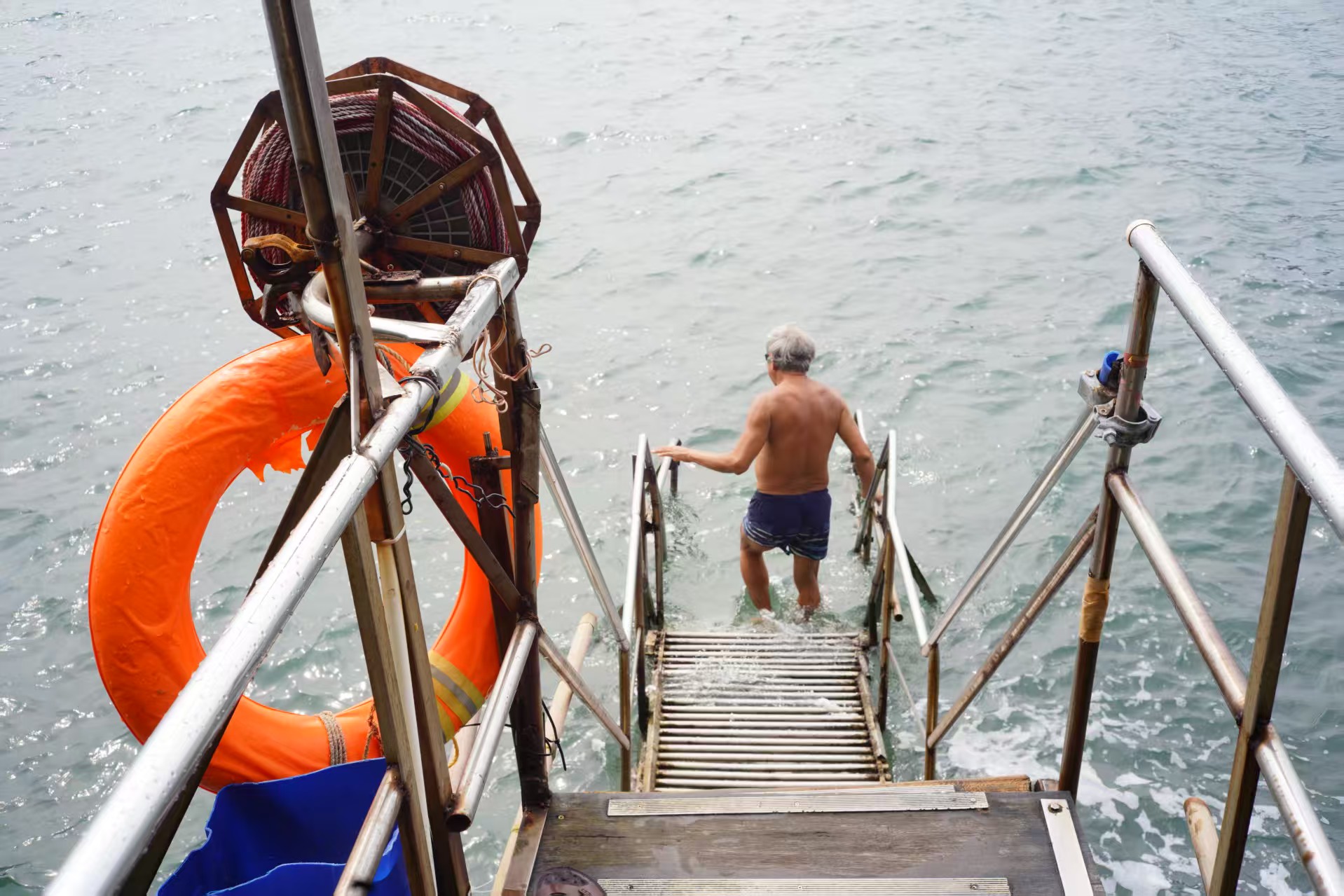坚尼地城附近的山崖下面的游泳处,大叔在中流击水
